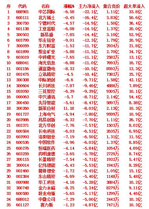 10月14日尾盘30分钟,主力资金大幅卖出的35名单! 中芯国际:主力净流出22.1亿元,集合竞价成交1.11亿元。 北方稀土:主力净流出16.4亿元,集合竞价成交3.83亿元。 宁德时代:主力净流出14.9亿元,集合竞价成交1.50亿元。 工业富联:主力净流出14.5亿元,集合竞价成交1.37亿元。 新易盛:主力净流出14.4亿元,集合竞价成交3.10亿元。 华友钴业:主力净流出12.3亿元,集合竞价成交1.79亿元。