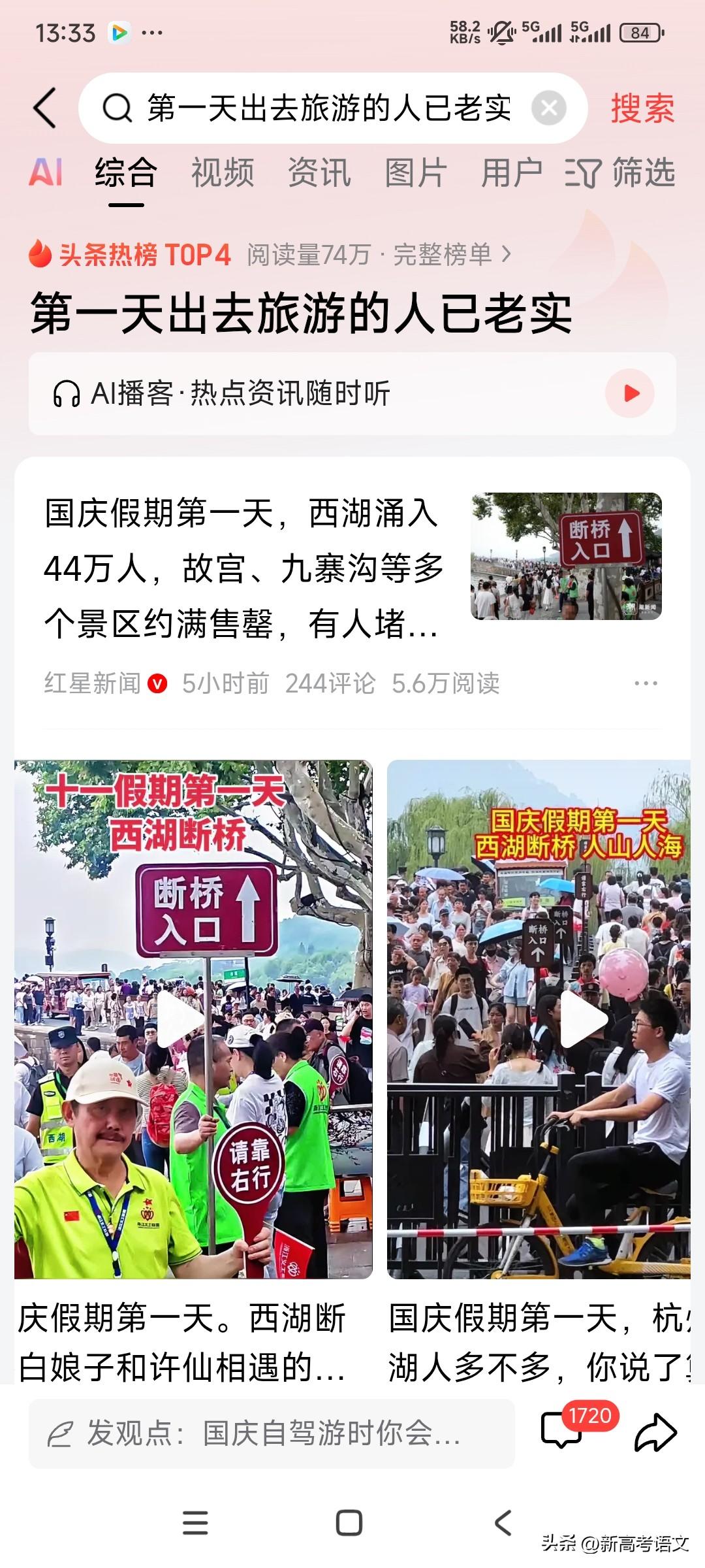 10月1号堵在高速上的游客今日已经抵达景区现场。 现在高速不堵了,景区又开始堵了,据说西湖涌进了44万人。 会不会踏出另外一个断桥都难说。 有网友戏称,仿佛全中国的人都来北京了,这不是来旅游,仿佛是在攻城。[大笑] 想象着5天以后这些堵在景区的人又开始重新堵在高速路上。那将会是什么样的场面儿呢? 有没有八达岭的现场照片儿呢?欢迎全国各地的网友们奉献。返乡人高速堵车 黄金周高速堵车