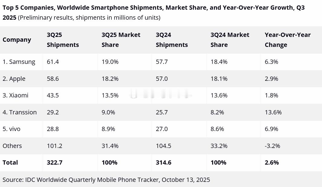 小米手机又又又又又又全球第三传音第四,vivo第五手机市场数据分析​​​
