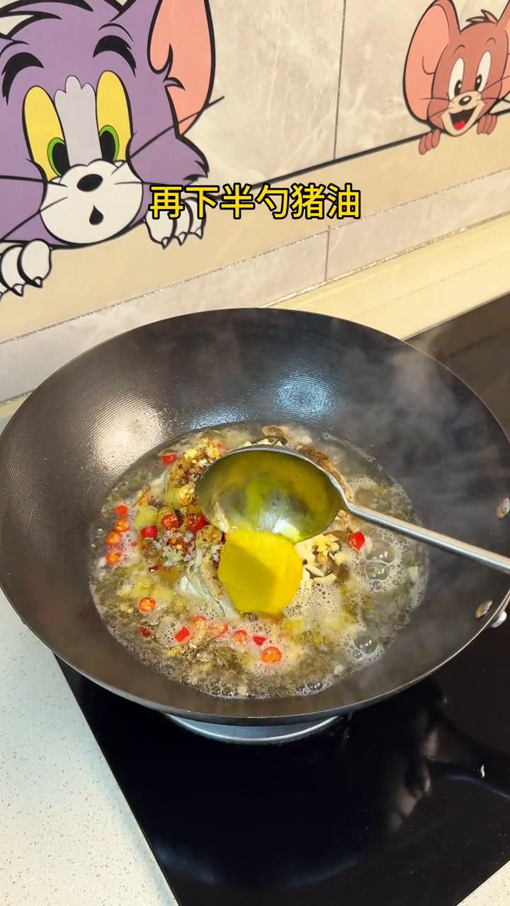 口味鱼泡。 ·鱼泡直接下锅,倒入小半碗白酒,加入清水没过食材,焯好水捞出沥干水分备用。 ·另起锅下鱼头,开中小火慢煎,翻个面继续煎香。 ·接着下姜蒜末、泡椒、小米辣、一勺辣椒末,炒香倒入半碗啤酒,加入适量清水,再下半勺猪油,倒入鱼泡。 ·调味只加盐和胡椒粉,扣盖子大火煮90秒钟。 ·到时间淋入香油、青椒圈,开大火收浓汤汁,最后撒上葱段、紫苏就好了。