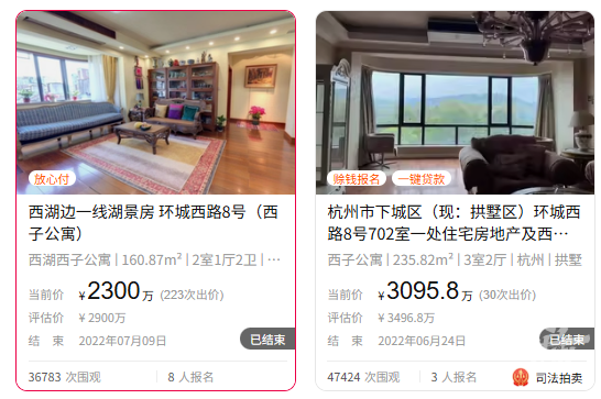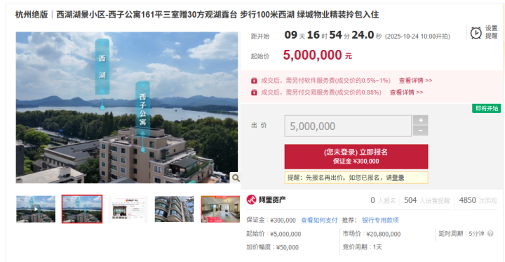 近日,一套位于杭州西湖边初代高总价小区——西子公寓的稀缺房源在阿里资产拍卖平台上架,引发市场高度关注。