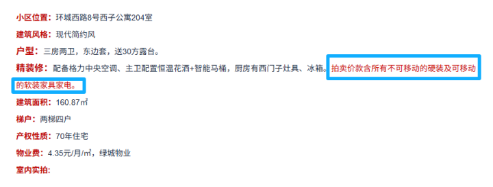 值得注意的是,拍卖价款涵盖了所有硬装及可移动的软装、家具、家电,竞得人可实现“拎包入住”,省去后续装修投入。