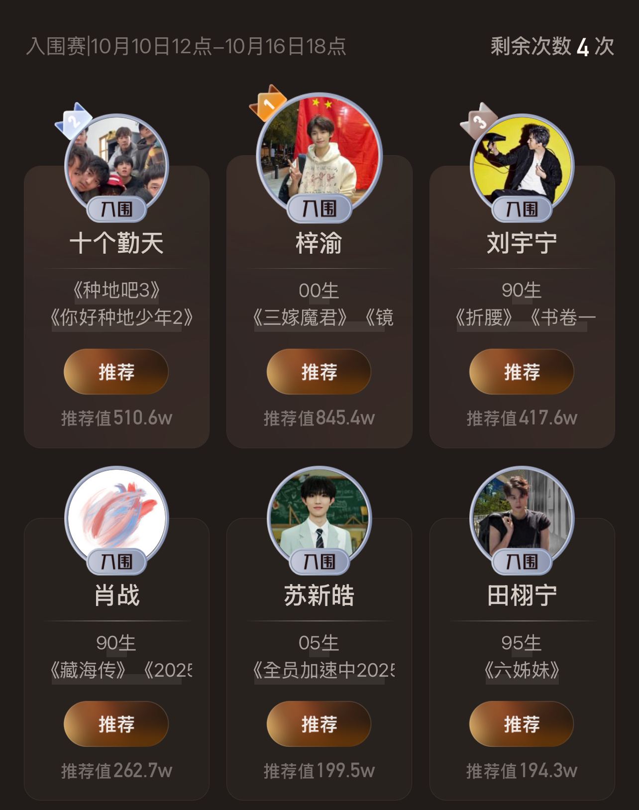 一觉醒来,这个排名有变化,梓渝还是第一,但田栩宁第六了,因为恋情事件导致排名下降