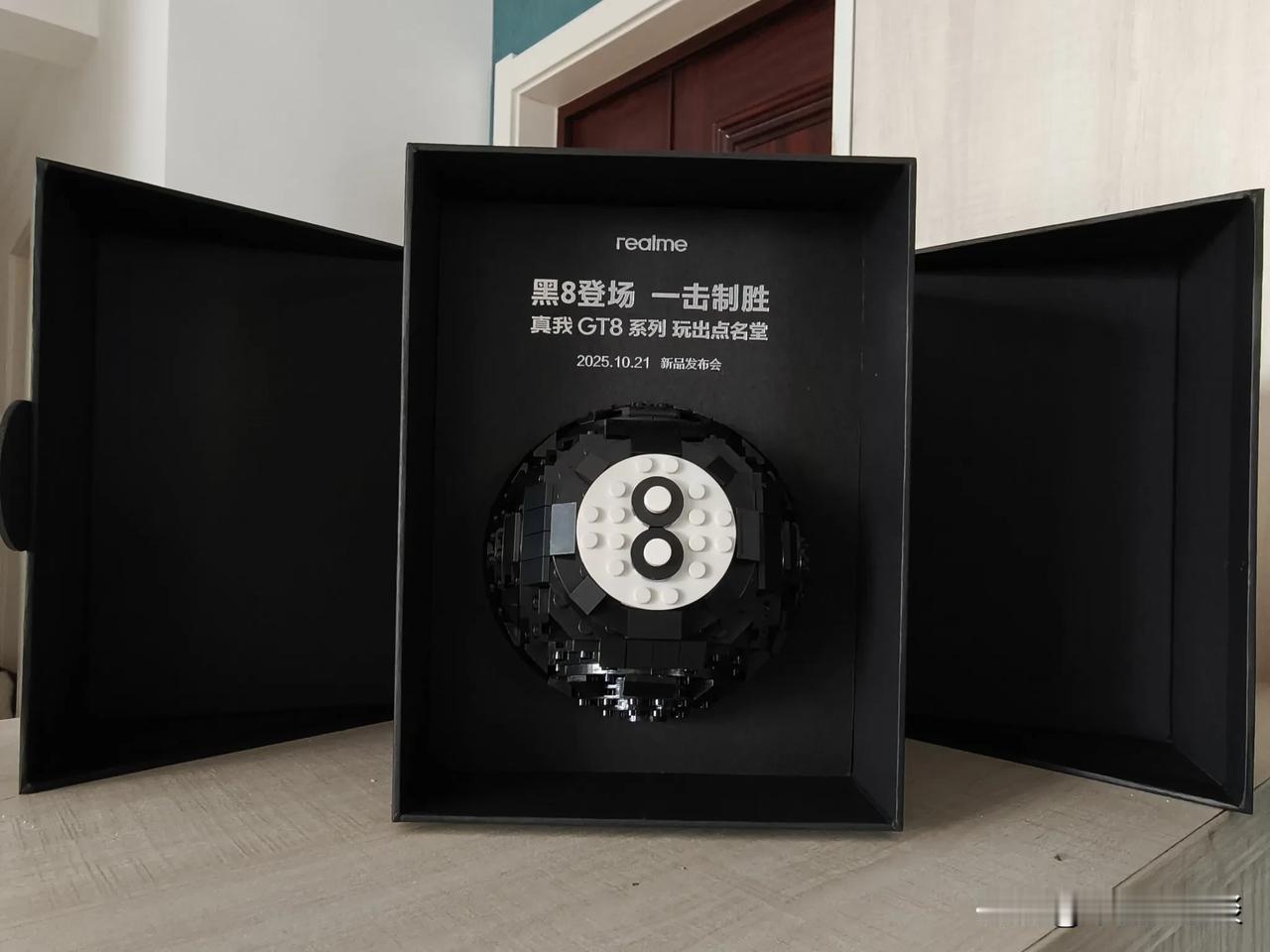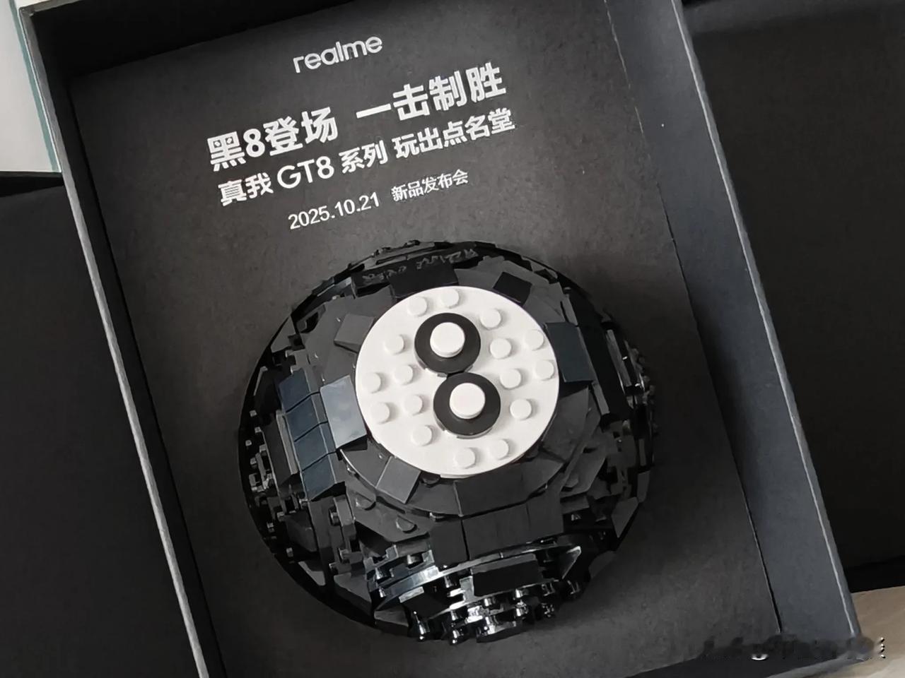 收到真我GT8系列新品手机发布会邀请函,真我GT8正式定档10月21号下午三点发布!邀请函里是一颗黑8的桌球摆件,采用颗粒模型拼装,看起来又酷又有质感。 这次发布会是双旗舰齐发,街拍神器真我GT8Pro和最强标准版真我GT8联袂出击,全球首发理光GR影像系统,拭目以待在性能、影像、设计玩出点名堂!