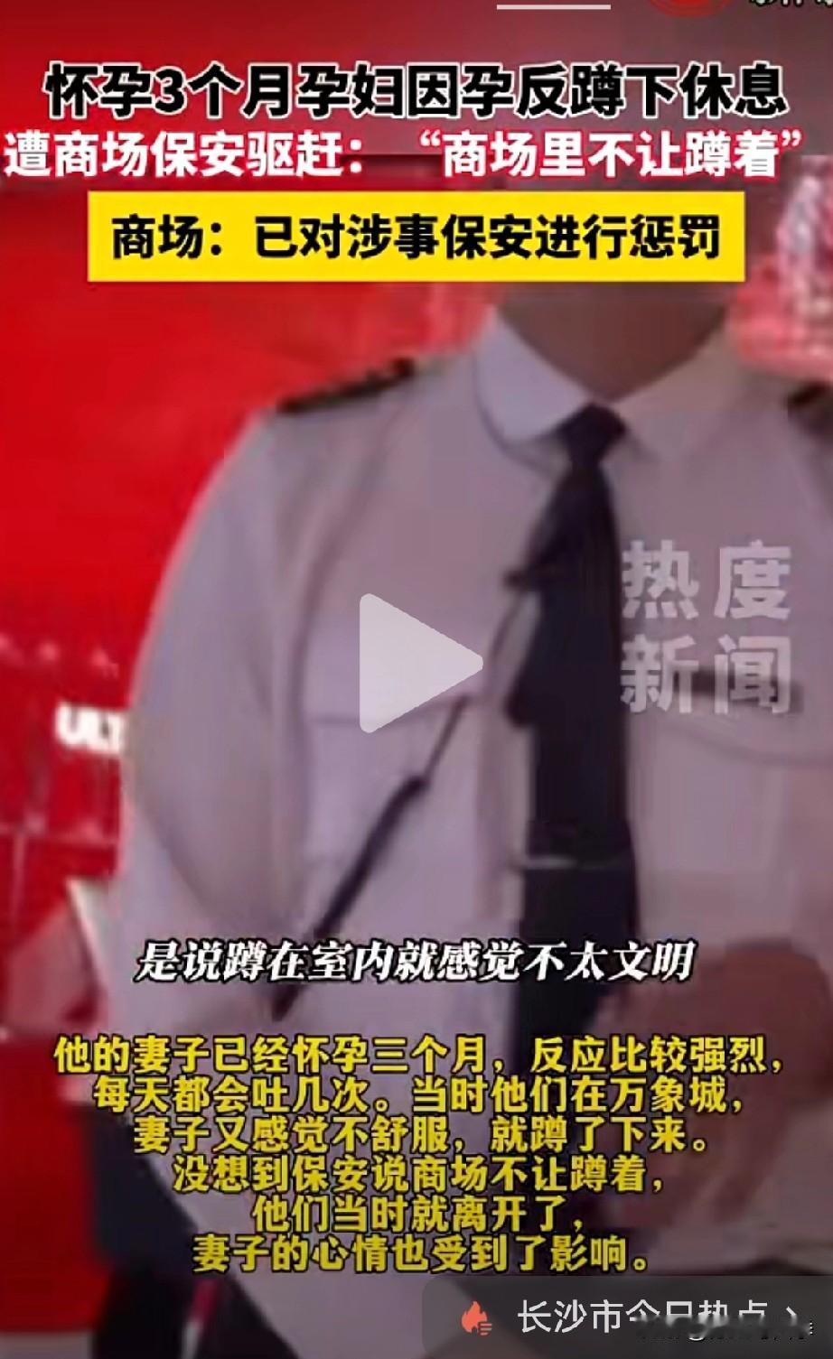 长沙一孕妇在商场里蹲着,遭到保安驱赶,说是蹲在那里不文明,是按领导说的行事!
