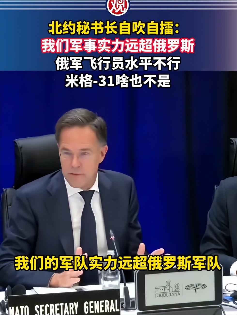 这不是自信,这是自吹自擂,我感觉北约秘书长疯了,居然说北约的军队实力远超俄罗斯,还说俄罗斯俄军飞行员水平不行。然后还刻意强调米格-31啥也不是。不知道吕特是否相信自己说的这些话。如果说北约真的如同吕特说的那么厉害,为什么冲突3年了,乌军节节败退?谁不知道,俄乌冲突,北约早就下场了。但结果呢?我认为他就是在吹牛,也是在为自己壮胆。事实上,我们都知道,欧洲人怕俄罗斯怕的要死!
