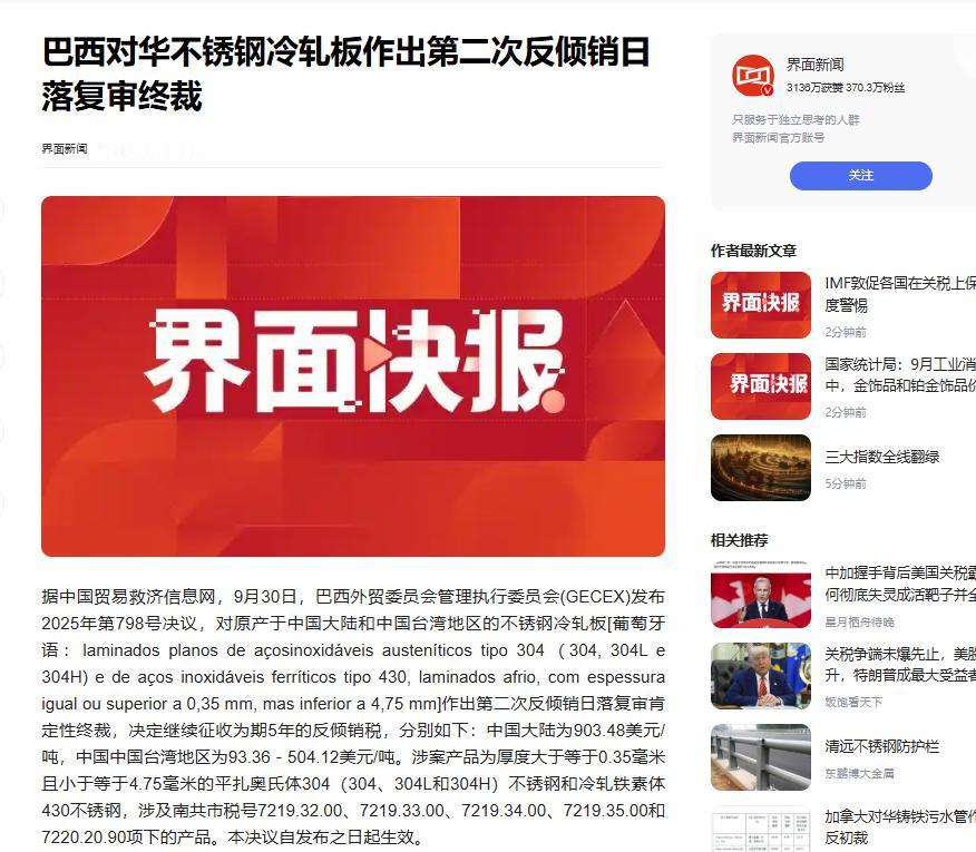 2025年10月13日,巴西外贸委员会正式宣布,对从中国进口的不锈钢冷轧板继续征收反倾销税,税率定在903.48美元/吨,一征就是五年。 说起来,巴西这操作可真够偏心的,把对大陆和台湾地区不锈钢冷轧板的差别对待摆得明明白白,903.48美元/吨对93.36到504.12美元/吨,近十倍的税率差可不是笔小数目,同样生产304、430这些市面上最常见的型号,大陆企业平白要多掏一大笔钱。 这事儿还得从源头说起,巴西对不锈钢冷轧板的反倾销调查早就是老戏码了,早在2012年4月就把大陆、台湾地区和另外六个国家一起拉进了调查名单,折腾到2013年先给大陆定了税,2019年第一次到期没松手,续了五年,现在干脆再来个五年,这哪是反倾销,简直是给大陆企业量身定做的长期“成本枷锁”。 而背后推波助澜的,正是巴西本土的不锈钢企业AperamInoxAméricadoSulS.A.,2024年4月刚递了申请,巴西外贸委员会立马就启动调查,年底就出了终裁,这效率快得像是早就准备好的剧本。 真正让人觉得不对劲的是税率的算法,这才是藏着“欺负人”的门道。巴西在反倾销调查里向来爱用“第三国替代”的套路,就像2025年对中国自行车轮胎反倾销时非要拿印度当参照算“正常价值”一样,这次对不锈钢冷轧板大概率也玩了同样的花样。 大陆作为全球最大的不锈钢生产国,从镍矿冶炼到冷轧加工的产业链完整得很,成本控制本就有天然优势,出口价格合理偏低是实打实的竞争力,但巴西偏不按大陆企业的实际成本算,非要找个成本高的第三国当标准,这么一对比,自然就把“合理优势”算出了“倾销幅度”,硬生生把税率抬到了903.48美元/吨。 反观台湾地区,巴西算出来的倾销幅度就低得多,给的税率也跟着降了档,这根本不是按产品质量或价格公平裁定,纯粹是针对大陆的双重标准。 台湾地区企业能拿到低税率也不是偶然,这些年台湾的钢铁企业早就把海外布局玩得很溜,像唐荣铁工厂这类企业不仅在台湾本地扎根,还转投资马来西亚、日本的钢铁厂,说不定早就和巴西当地企业搭好了合作关系,或者在出口策略上故意弱化了价格优势的表象,不像大陆企业一门心思靠性价比拼市场,反而成了被盯上的靶子。 从数据就能看出,巴西每年的不锈钢进口里75%都来自亚洲,大陆更是主力,2018到2023年南共市的不锈钢管进口中,大陆占比就超60%,这么大的份额让巴西本土企业坐不住了,毕竟他们自己的产能根本跟不上需求。 2025年针对热轧板的调查里也提到,中国、印尼、印度三地占了巴西同类产品进口的65%以上,本土企业拿不出竞争力,就只能求政府用反倾销税当“保护伞”。 更讽刺的是,巴西自己也清楚本土产能没法完全替代进口,之前对圆形不锈钢管的反倾销政策里就明说“本土产能无法完全替代进口需求”,这简直是自相矛盾——一边离不开进口,一边又把最大的优质供应方往门外推。 加了这么高的税,最后要么是巴西国内的下游企业被迫接受更高的原材料价格,要么是找印尼、印度这些替代方,但这些国家的产能和价格都未必有优势,最后买单的还是巴西自己。 这种操作其实在新兴市场里不算新鲜,巴基斯坦之前对中国的彩色涂层钢板收反倾销税,理由也是保护本土产业,本质上都是本土企业一喊疼,政府就出手,不管实际是不是真倾销,先把外来的“威胁”挡一挡再说。 但巴西没算明白的是,中巴经贸关系里,大陆可不是只卖不锈钢。双方在大豆、铁矿等领域的合作体量巨大,大陆是巴西农产品的重要买家,现在偏偏在不锈钢冷轧板上搞这么一出差别化对待,而且一锁就是五年,这明显是给双边经贸添堵。 要知道,大陆的不锈钢产业早就不是靠低价竞争的阶段了,像宝武太钢能给巴基斯坦核电站的“华龙一号”核心设备供钢,连巴基斯坦最大的核电设备制造商都给太钢发了合作纪念铭牌,这说明产品质量早就经过了高端市场的检验。 说到底,这种带着偏心的贸易限制,短期看是帮了本土企业,长期看反而会让他们失去进步的动力,更别提还伤了和大陆这个重要贸易伙伴的关系,这笔账怎么算都不划算。