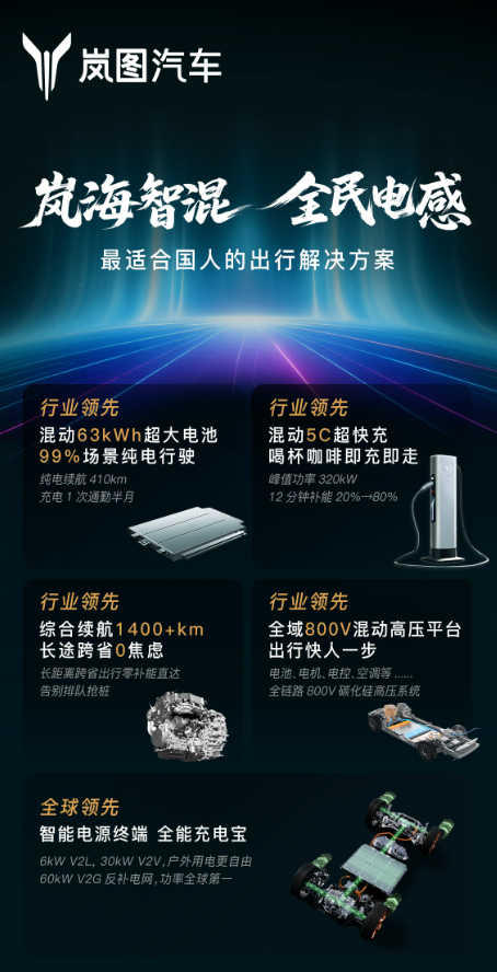 全系63度大电池+800V,纯电续航410km,只有插混,暂时没有纯电计划。
