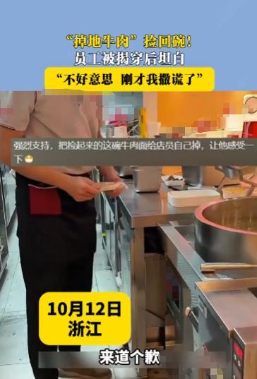 “太缺德了!”10月12日,浙江,一男子取餐时,看到店员竟然将掉在地上的牛肉捡起来,顺手放进了他的餐里,男子要求换一碗,店员原封不动又将那碗面端了上来,被戳穿后才坦白,网友:看不到的地方这种事不知道发生了多少次! 民以食为天,在外吃饭时食品安全和卫生始终是大家最关注的,可仍然有些缺德商家对这方面管理疏松,掉在地上的东西店员还捡起来给顾客吃。 一男子在外吃饭点了碗牛肉面,取餐时他眼睁睁看着店员不小心将一片牛肉掉在了地上,随后竟然若无其事捡起又放进了碗里。 这可把男子给恶心坏了,他上前质问这名店员,要求重新给自己做一碗,显然店员没想到男子就在旁边,有些慌了神,连连答应。 不一会儿,店员告知男子重新做好了,男子上前一看,这碗面居然还是刚才那碗,上面配菜的摆放几乎都没改变。 愤怒之下男子拿出手机开始拍摄,店员见自己的小聪明被揭穿,害怕造成更大的影响,急忙上前给男子道歉,承认自己撒谎。 不少网友认为店员的行为过于熟练,根本没有顾虑,在顾客看不见的地方这种事不知道发生了多少次,在外吃饭还是要注意这些事,而店家也应该加强这方面的管理,不然谁还敢出去吃? 信息来源:《“掉地牛肉”捡回碗!》大象新闻