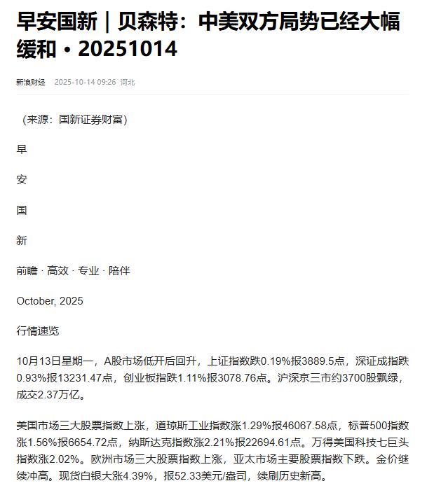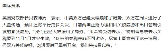 美财长声称,中美关系已经缓和,中美双方有望在韩国实现会晤!10月13日,美国财长贝森特表示,双方周末进行了实质性的沟通,局势已大幅缓和。特朗普总统表明,关税措施会推迟到11月1日生效。中国是指令经济国家。但他们既无法指挥我们,也无法控制我们。 贝森特的表态,仔细琢磨全是心虚的破绽。就说他嘴硬的“指令经济国家”论调,这说法简直是脱离现实的自我安慰,要是中国真靠指令运转经济,怎么可能在全球产业链里攥住那么多美国离不开的命脉? 就拿刚被热议的工业级人造金刚石来说,这东西不是用来做钻戒的奢侈品,而是芯片制造的“工业牙齿”,切割晶圆、精密抛光全得靠它,尤其是台积电搞的2纳米技术,离了高纯度金刚石散热根本玩不转。 中国光这一项的全球产能就占了95%以上,河南一个省就贡献近六成,美国每年用的人造金刚石粉末77%都来自中国,而且99%全用在半导体制造上,要是真能“指令”,直接断供不就完了? 可中国从来没这么干,反倒是美国自己搞出口管制搞得上蹿下跳,这分明是市场经济的实力碾压,哪来的“指令”一说。 还有他那句“无法指挥也无法控制”,这话喊得越响,越说明心里发慌。美方一边把出口管制玩到极致,清单上的物项超过3000项,比中方多了两倍多,还搞出个0%最低含量规则,哪怕产品里就沾一点中国技术都不让卖,把长臂管辖的霸道发挥得淋漓尽致。 另一边却天天盼着跟中方沟通,生怕中方真的切断关键材料供应,这种又打又求的姿态简直矛盾到滑稽。 就说稀土,之前美国就想让中国取消出口限制,贝森特自己都松口说愿意取消三位数关税换稀土松绑,这哪是“无法控制”,分明是被掐住了脖子不得不服软。 更有意思的是,10月10日特朗普刚宣布11月1日要加征100%关税,美股当天就慌了神,标普500指数单日跌超2%,创下今年4月以来最大跌幅,美国的商界、农业、航运业全急了,纷纷施压政府松口,这才有了贝森特几天后改口说“关税不一定发生”,这种朝令夕改的操作,哪里看得出半分“硬气”? 所谓的“实质性沟通”和“局势缓和”,说到底就是美方扛不住了想找台阶下,盼着用点口头让步换中方的实际好处。要知道,美方4月就给中国航运业下绊子,宣布对中国船舶加征港口费,按每净吨50美元收,还逐年涨价。 结果呢?中国航运企业早有准备,东方海外8月就开了新航线,从青岛到墨西哥恩森纳达港比经洛杉矶中转省7天,直接绕开美国港口,中远海控上半年其他国际航线增幅都达11.9%。 反观美国洛杉矶港,4到6月航次取消量暴增,中国至美西集装箱订舱量同比暴跌44%,中资船靠港频次降了18%,美国的农产品要出口、制造业要零件,没航运根本玩不转,最后买单的还是美国企业和消费者。 等到10月14日中方反制措施准时生效,对美资船舶收每净吨400元人民币,还逐年递增,贝森特立马就换了腔调,说“沟通渠道已重新开放”,这哪是“实质性沟通”,分明是中方反制出了效果,美方不得不服软。 而且这种“松口换让步”的套路,美方早就用过了。今年5月日内瓦经贸会谈上,贝森特就代表美方取消了部分行政令加征的关税,换中方暂停相应反制措施,现在不过是故技重施。 可中方早就把话挑明了,“不愿打但也不怕打”,从来不吃这一套。美方想靠推迟关税生效这种小恩小惠就占便宜?看看中方的反制力度就知道没门。 中方的特别港务费政策设计得明明白白,分阶段递增既显决心又留余地,还特意豁免了中国建造的美相关船舶,既护着本国造船业,又没把话说死,这种张弛有度的应对,比美方的反复横跳高明多了。 贝森特心心念念的韩国会晤,更像是美方急于打破僵局的救命稻草。10月底亚太经合组织领导人会议要在韩国开,这是特朗普想找机会秀存在感、捞谈判筹码的好场合。毕竟现在美国的高科技产业快扛不住了,除了人造金刚石,稀土领域也一样依赖中国,之前就因为中方出台稀土新规,美方急得跳脚要谈判。 可中方早就表态,出口管制不是禁止出口,想让中国让步得拿出真诚意,光靠贝森特嘴上喊“缓和”根本没用。 说白了,美方现在就是典型的“打不过又离不开”,贝森特的喊话与其说是自信,不如说是给美国国内看的安慰剂,真要到了谈判桌上,还得看中方的节奏。