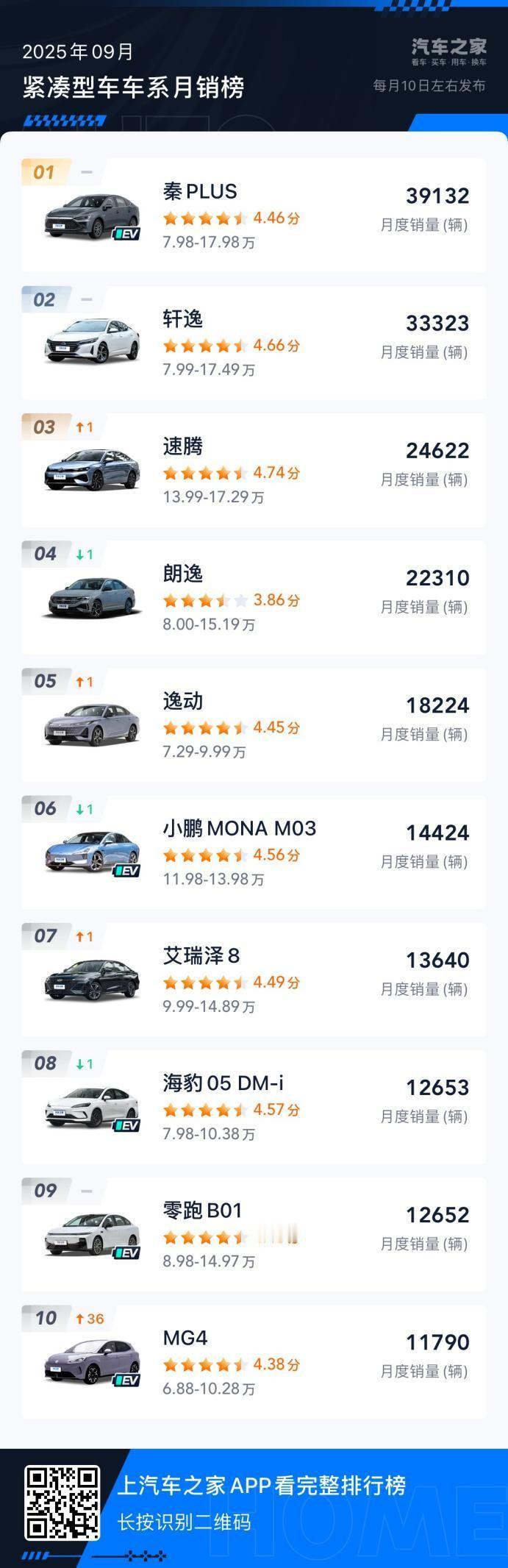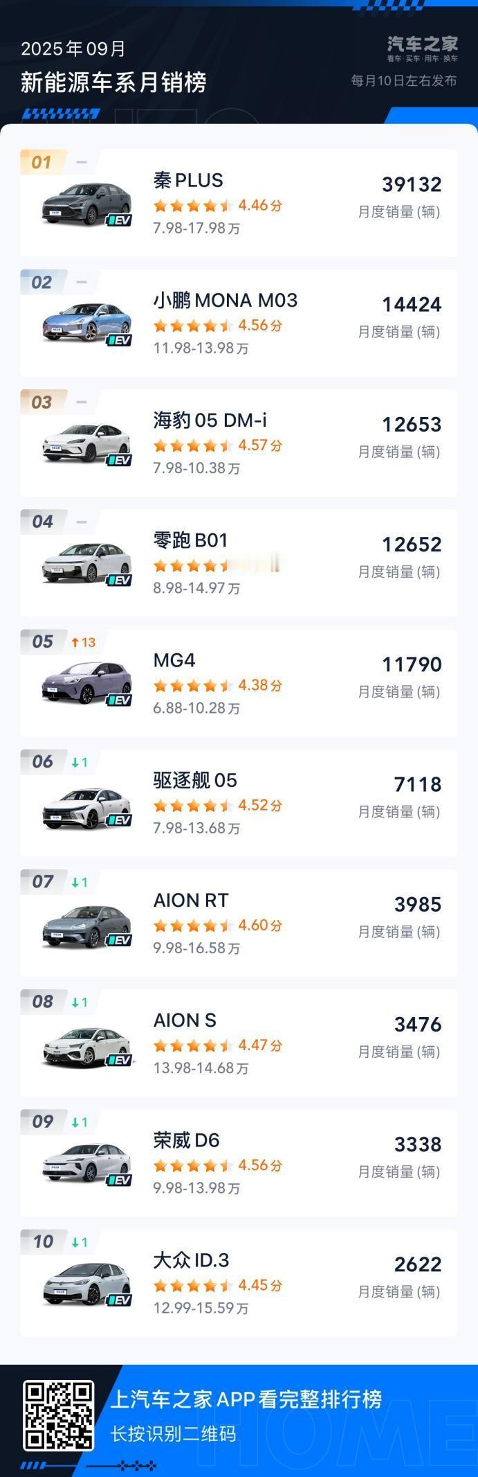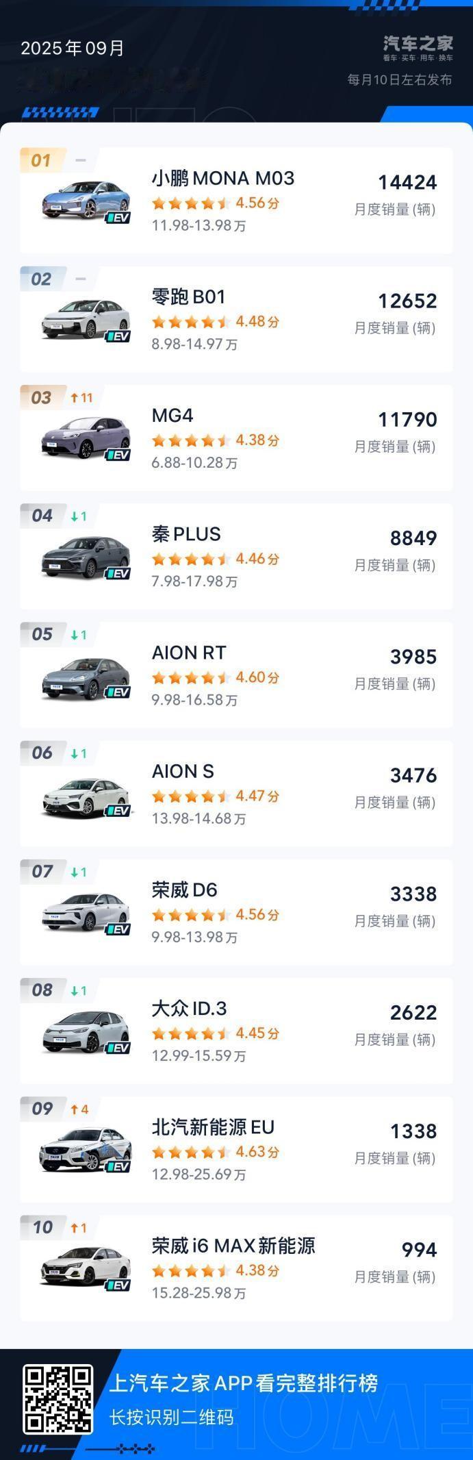 9月销量榜新鲜出炉!全新MG4这波表现真的太抢眼了,首月就卖出近1.2万辆,直接杀进纯电动车销量榜前三、新能源紧凑型车前五,连总榜前十都稳稳拿下! 不得不说,这台车真的把"性价比"玩明白了。7万出头就能买到400km续航,9万内直接上530km超长续航,还标配了高通8155芯片和OPPO智行互联,这配置放在同价位里简直就是"降维打击"。 更关键的是,现在全国400多家门店都在持续交付,产能还在稳步提升,加上超1000家服务网点做后盾,买起来用起来都特别踏实。照这个势头发展下去,后续销量肯定还会再往上冲! 这样诚意满满的小车,成为爆款真的只是时间问题。强烈推荐预算十万左右的朋友,一定要去试驾体验一下! 全新MG4首月热销11790台