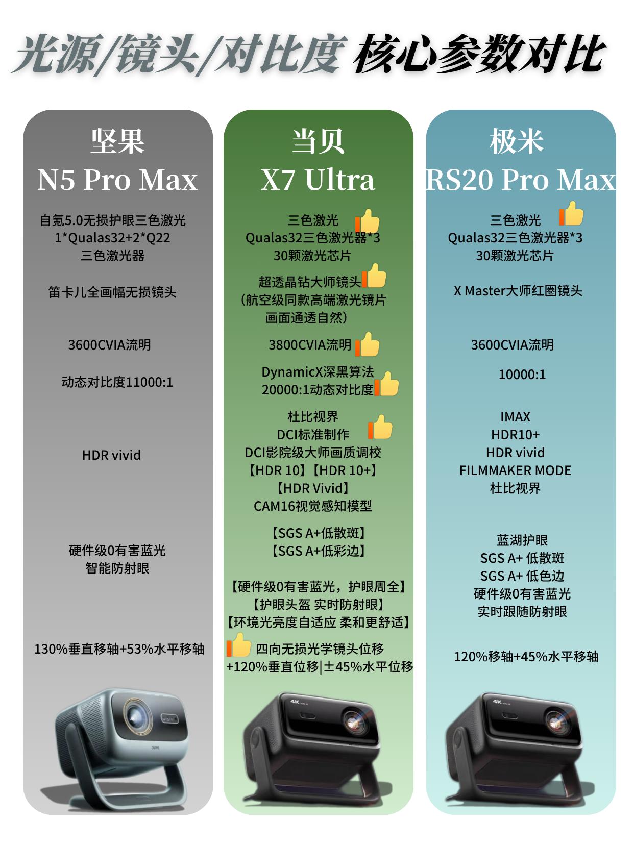 8K旗舰投影神仙打架?别光看亮度,核心配置才是关键! 有人问8K价位段的旗舰投影怎么选,特别是坚果N5 Pro Max、当贝X7 Ultra和极米RS20 Pro Max这三台。表面一看,哎,都是八千价位,好像都差不多? NONO,今天就带大家深扒一下: 1.光源 这三台都说是三色激光,但此“三色”非彼“三色”! �� 当贝X7 Ultra 和 极米RS20 Pro Max,用的都是实打实的「Qualas32三色激光器3」。这是目前旗舰投影的“顶配”方案,红、绿、蓝三个激光器独立工作,色彩纯净度没得说,是真·三色激光。当贝还在这三台投影中亮度独占鳌头,是3800CVIA! ��再看 坚果N5 Pro Max,它的光源是「1Qualas32+2*Q22」。意味着它不是纯粹的3个独立的高规格激光器,更像是一个“混光”方案。在8K这个价位段,用这种方案来实现三色激光,只能说…有点不够意思了哈。想体验最纯正的三色激光画质,答案就很明显了。 其次,看“眼睛”——镜头和对比度。 画面的通透感和层次感,就看这里了。 �� 当贝X7 Ultra 直接给到了20000:1的动态对比度,是三台里最高的。搭配“超透晶钻大师镜头”,画面层次感和暗部细节表现力,理论上是这三台里最强的。看科幻片或者暗场景多的电影,高对比度的优势会非常明显。 �� 坚果N5 Pro Max 和 极米RS20 Pro Max 的对比度也都是不错的水准,但和当贝比起来,确实有差距。 最后,总结一下我的个人看法: �� 当贝X7 Ultra: 配置最扎实,纯三色激光+最高的对比度,在画质核心硬件上是“水桶机”,诚意最足。如果你是画质党,追求一步到位,选它基本不会错。 �� 极米RS20 Pro Max: 同样是纯三色激光,画质有保障,还有IMAX特色功能,综合实力很强。虽然对比度稍逊一筹,但如果你是IMAX片源爱好者,它会是你的菜。 �� 坚果N5 Pro Max: 亮度够,功能也全,镜头位移范围是三者最大,安装便利性上会好一点。但核心的光源方案在同价位里显得竞争力不足。