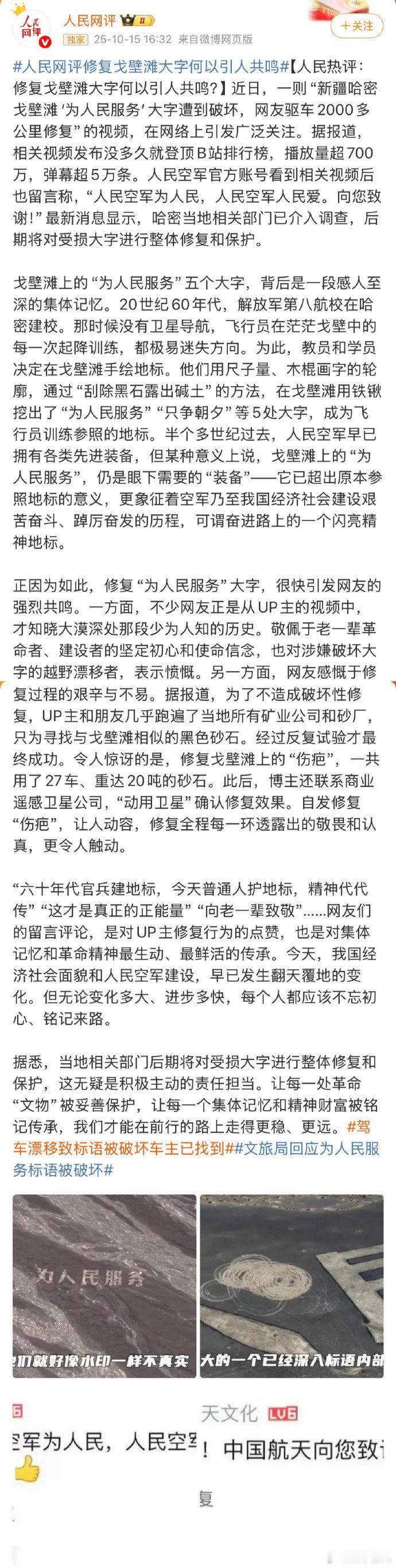 人民网评修复戈壁滩大字何以引人共鸣 从四处寻觅相似黑砂石,到动用27车砂石修复,再到联系卫星确认效果,网友修复戈壁滩大字的每一步,都满含对历史与初心的敬畏。