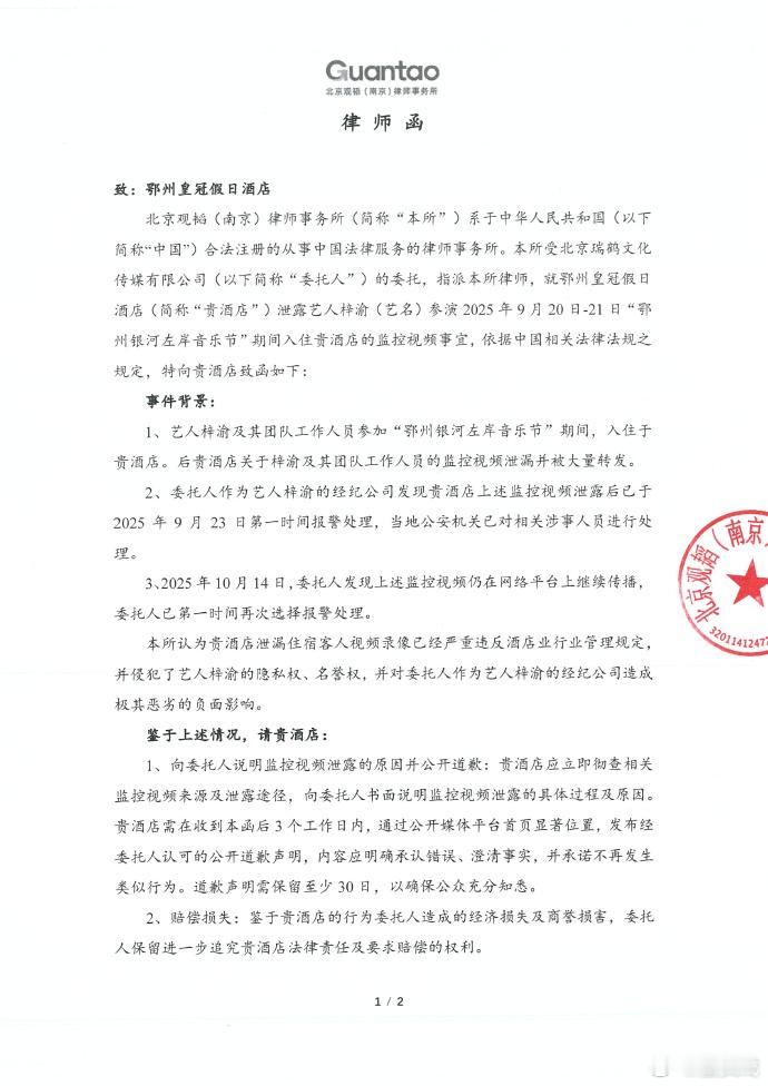 梓渝方律师函瑞鹤娱乐律师函瑞鹤娱乐发布关于梓渝先生隐私被恶意侵害泄露事件