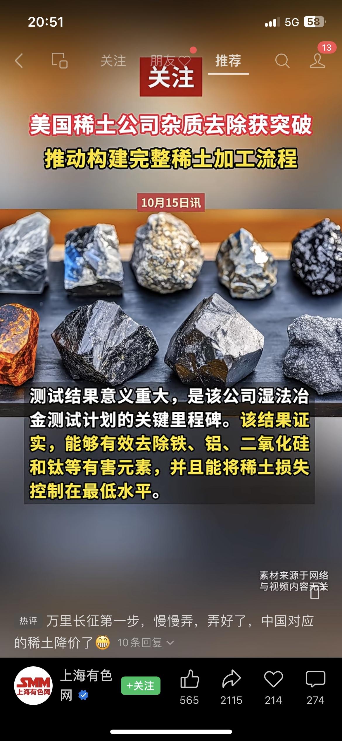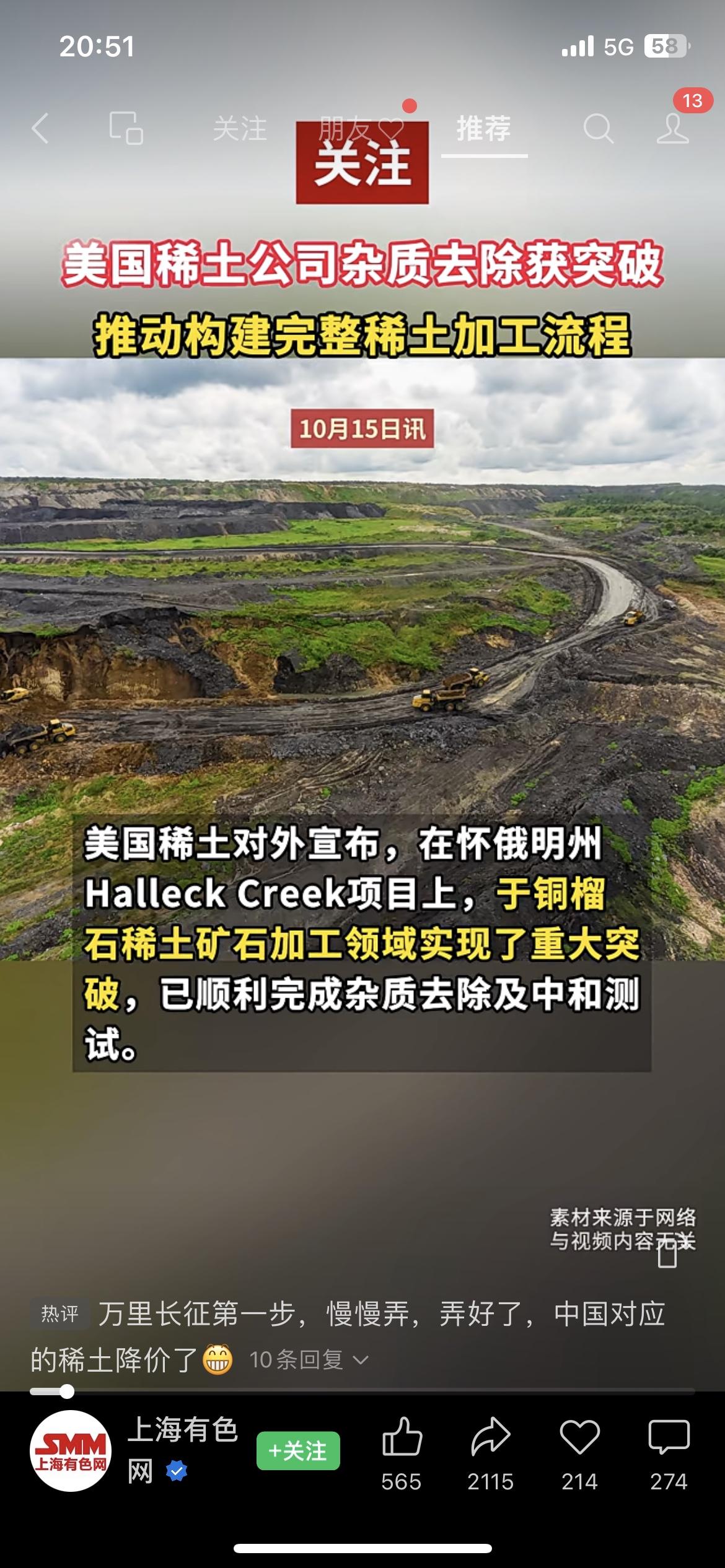 美国稀土加工技术取得进展,你怎么看稀土资源的全球竞争格局? 家人们,10月15日美国稀土公司宣布,在怀俄明州Halleck Creek项目的铜榴石稀土矿石加工领域实现重大突破,完成了杂质去除及中和测试,咱们来聊聊这事儿。 先通俗说说事件核心:这次测试能有效去除铁、铝、二氧化硅和钛等有害元素,还能把稀土损失控制在最低水平,是该公司构建完整稀土加工流程的关键一步,技术意义重大。 从产业链关联来看,这涉及稀土开采、加工、应用等多个环节,对应的稀土板块上市公司,以及下游的新能源、新材料、电子等产业都可能受到影响,因为稀土是这些产业的重要原材料。 从客观视角分析,稀土作为战略资源,技术突破向来是影响市场对其关注的重要因素。历史上,全球稀土产业的技术进展和资源争夺,都会引发市场对相关板块的情绪波动,但具体走势还要结合资源储量、政策环境、市场需求等多方面因素。 你觉得美国这次稀土加工技术突破会如何影响全球稀土产业链?来评论区聊聊。 本文仅为市场信息解读,不构成任何投资建议,据此操作风险自担。 美国稀土需求 中美稀土之争 美国稀土需求 A股热点 稀土资源