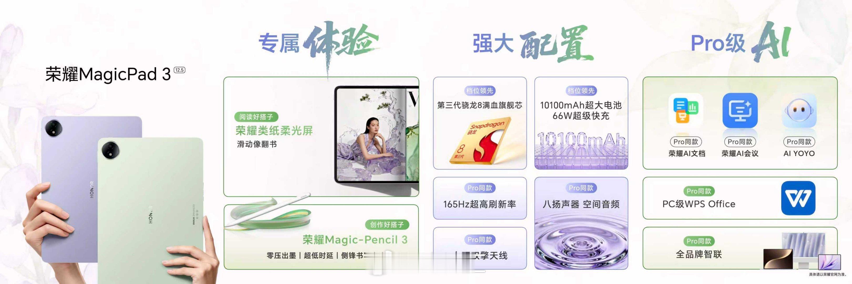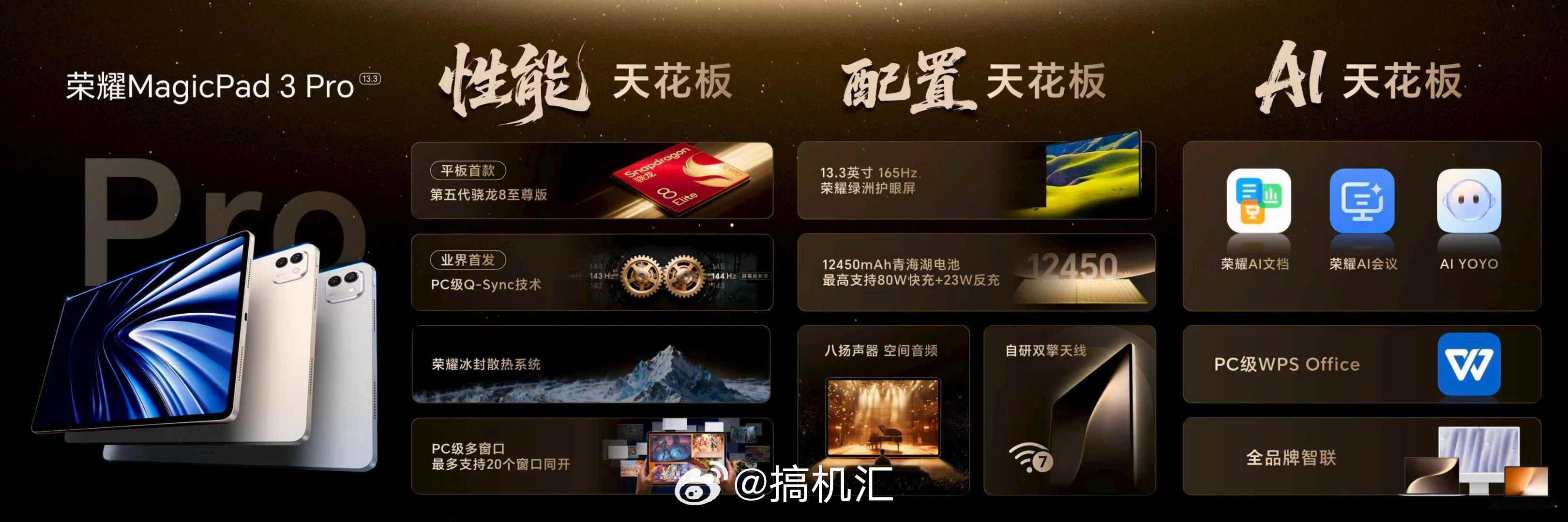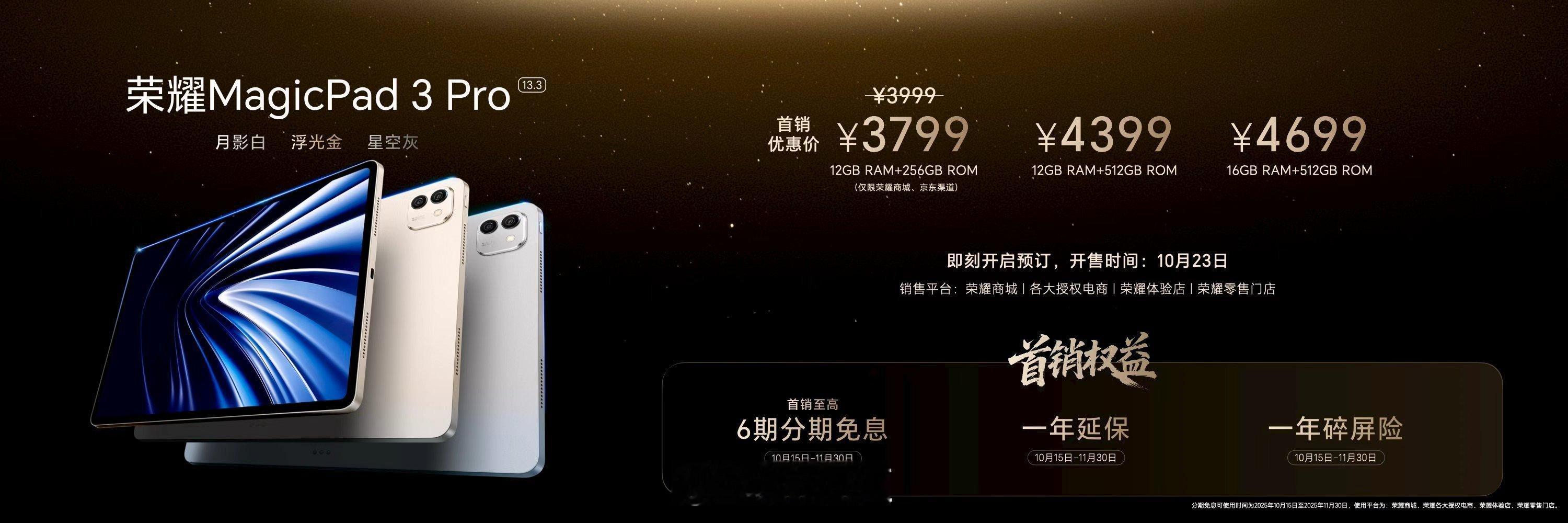 荣耀MagicPad3Pro首发第五代骁龙8至尊版芯片,打造性能、配置、AI体验天花板,于10月23日开启首销,首销优惠价3799元起;