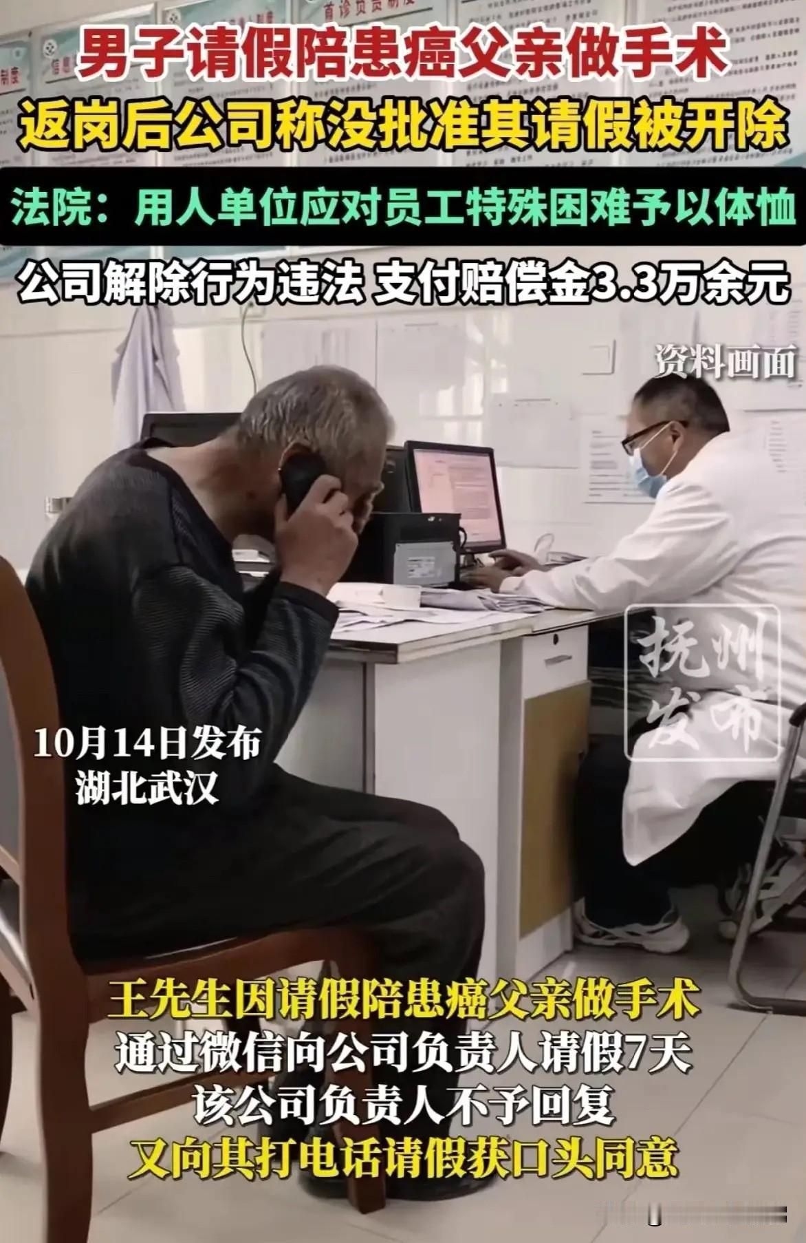 湖北武汉,男子要陪同患癌父亲手术,发信息跟总经理请假7天,总经理没回消息,男子又打电话请假。男子返岗后就被告知不用再负责采购工作,并被移出采购群,没过多久公司以旷工为由将男子辞退。男子申请劳动仲裁获赔偿,公司不服起诉拒绝支付赔偿,法院判决意料之中。 王先生是一家建筑公司的采购专员,2024年初他父亲确诊肝癌晚期需要做手术,作为家里的独生子,王先生肯定要在医院陪护。3月15日晚上,他通过微信向总经理详细说明了情况,还汇报了手头的工作安排,总经理收到消息后没回复,王先生又打电话沟通,得到一句"知道了"的回应。 王先生陪父亲做完手术后返回公司,发现自己的岗位已经被替换,还被移出了工作群。公司说他没按规定流程请假,算旷工,直接把他开除了。王先生觉得委屈,明明已经请示过领导,父亲病危这种特殊情况难道不能通融一下吗?他申请了劳动仲裁。 仲裁结果是支持王先生的诉求的,要求公司做出赔偿,但是公司不服气,把王先生告上了法院。法官认为,父亲病危属于紧急情况,微信请假虽然没走正式流程,但已经尽到了告知义务,公司没有及时回应,事后又突然辞退,确实不太合理。 有些公司死抠规章制度,忘了员工也是人,也有父母子女。现在全国有20多个省份都出台了独生子女护理假,就是鼓励大家尽孝心。公司管理遇到这种特殊情况是不是就得灵活处理呢? 员工遇到困难时公司多体谅一点,员工也会更愿意为公司多付出,那种"制度大于人情"的管理方式,是留不住人心。如果家里真有急事要请假,最好保留好证据,比如微信聊天记录、电话录音,同时也要走公司正规的请假流程,尽量按规矩来。 各位读者你们怎么看?欢迎在评论区讨论。