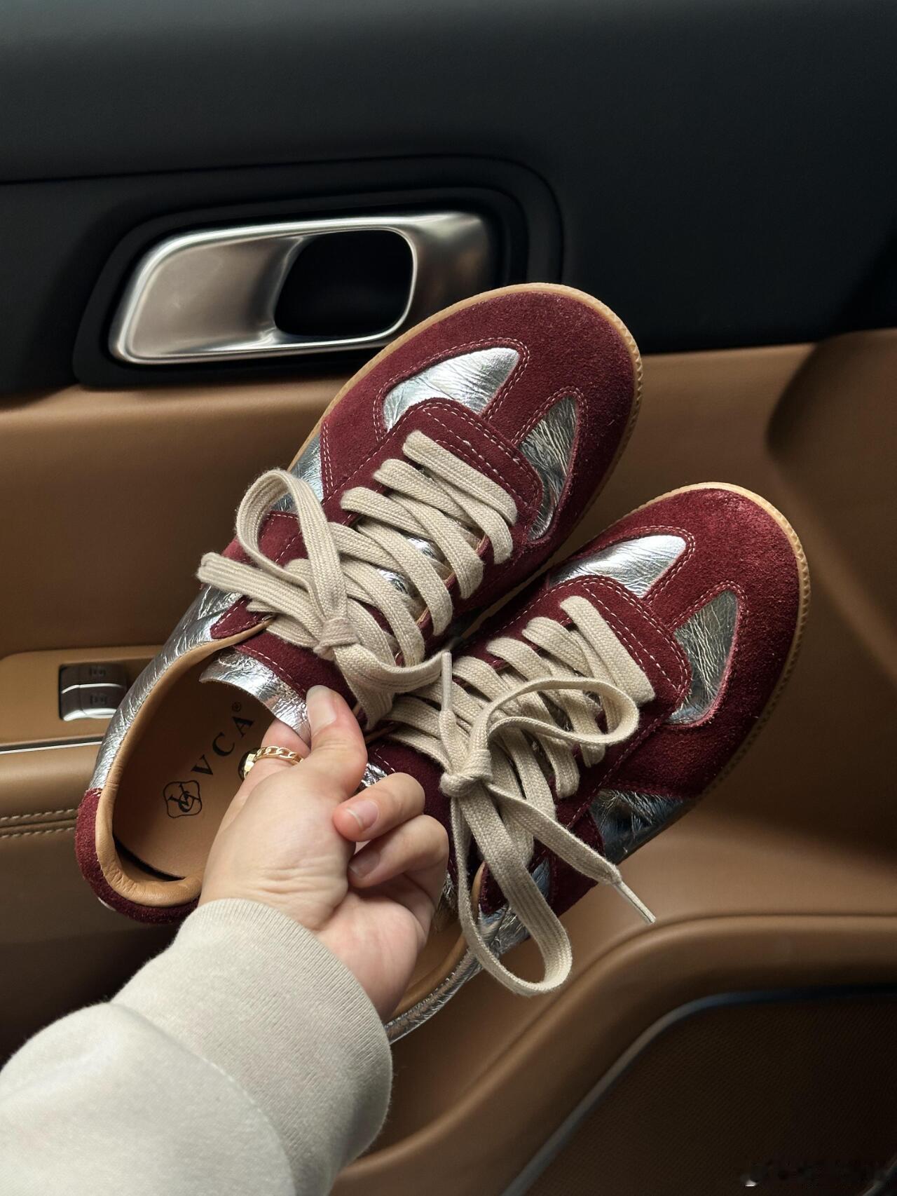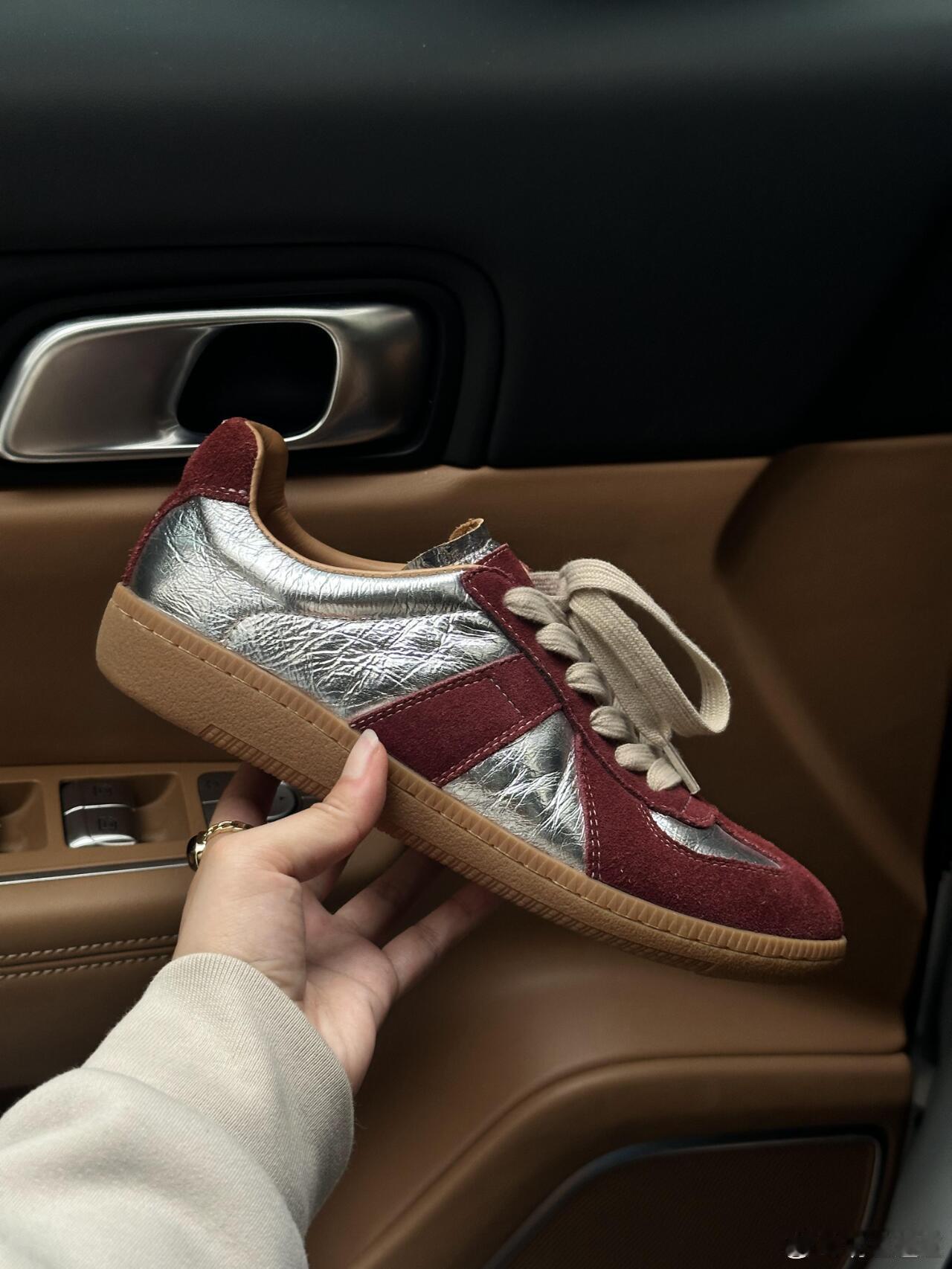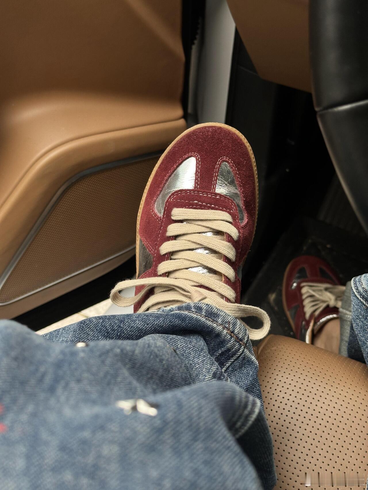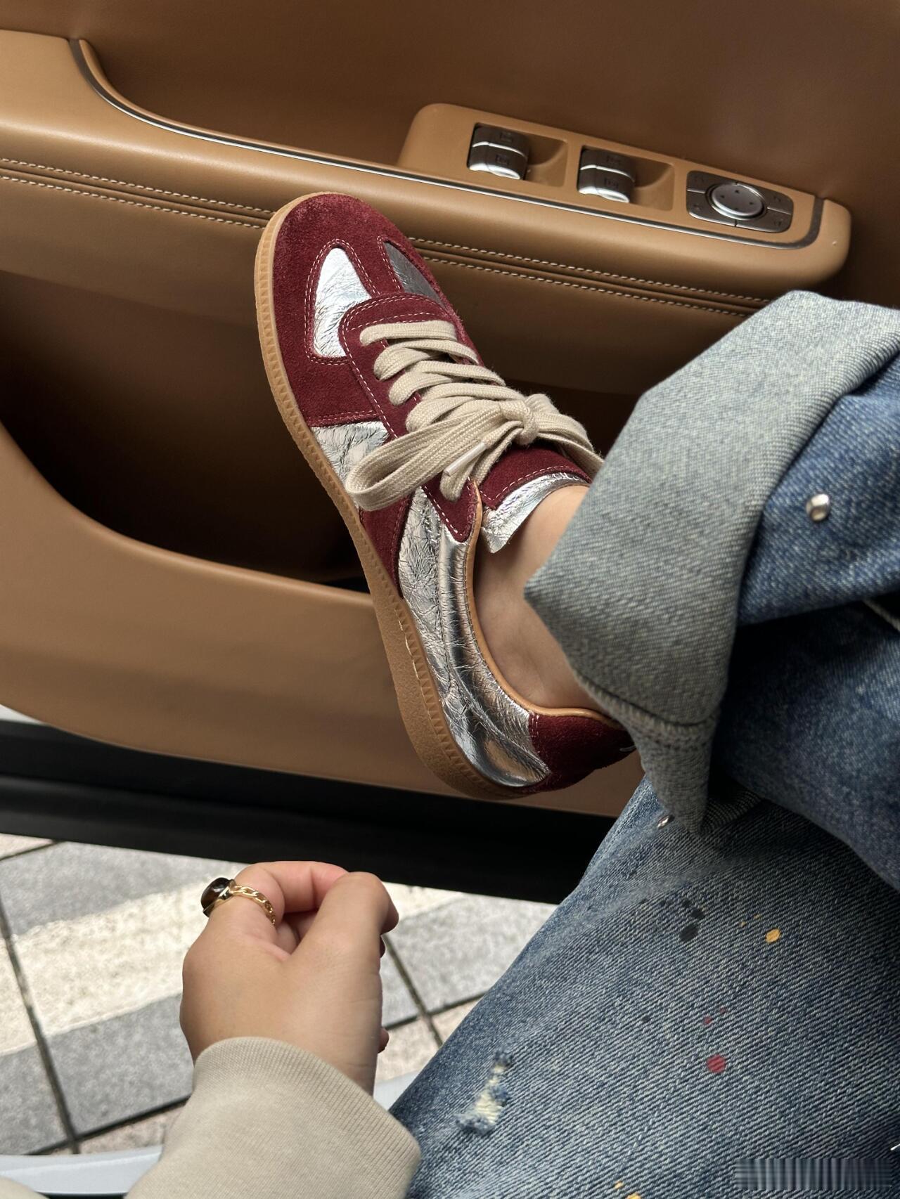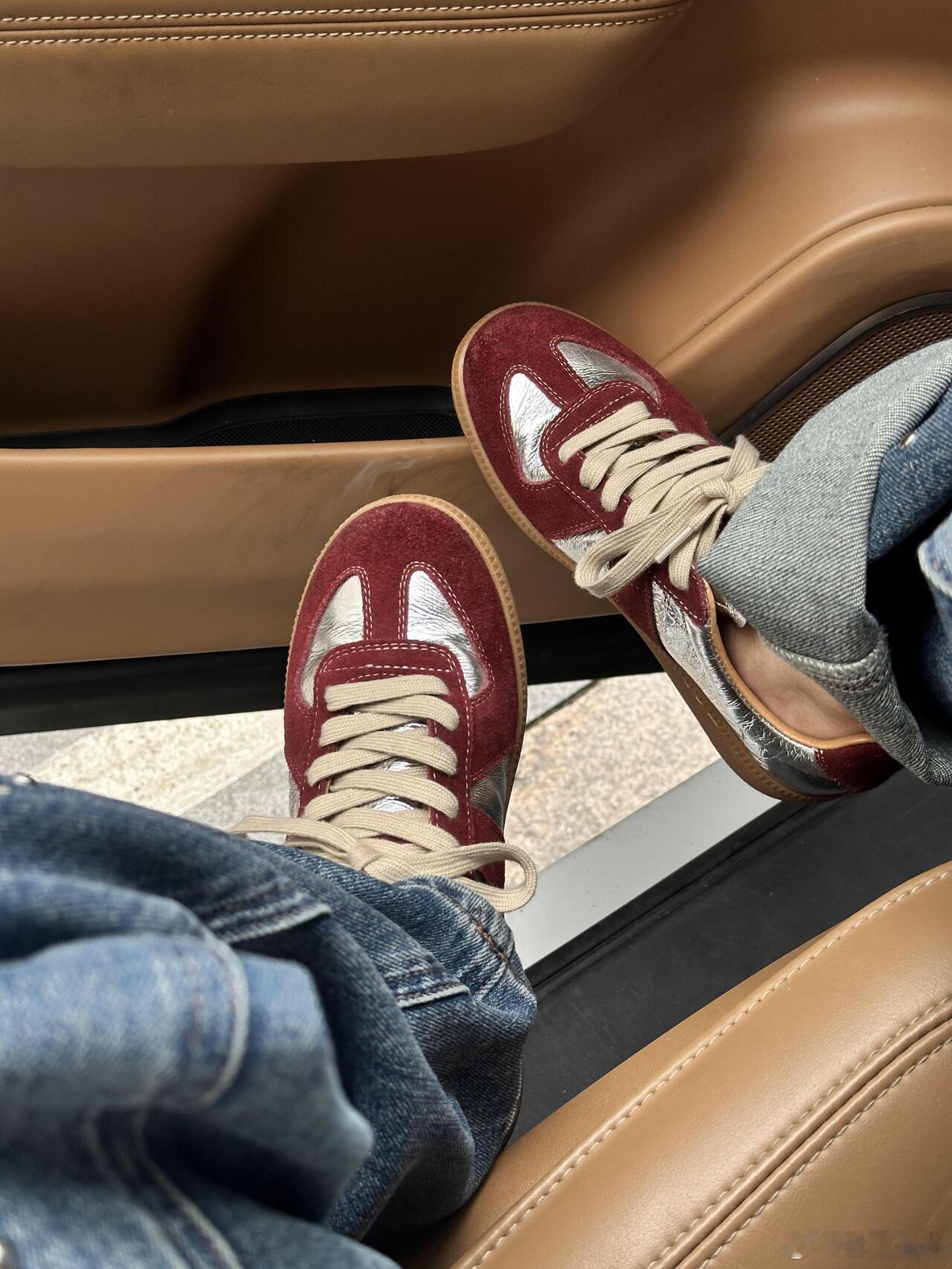 这双休闲鞋巧妙运用材质碰撞——酒红色麂皮鞋身与银色光面皮革在鞋头T字区交汇,搭配米白鞋带更显温润质感。深蓝色牛仔裤脚自然堆叠于鞋面,背景虚化的浅棕皮革车门与白色缝线勾勒出车内优雅环境。俯视角突显鞋型立体剪裁,暖金色调光影强化了麂皮的细腻肌理与金属皮革的流光效果。整体融合了复古运动基因与都市轻奢格调,无论是卷边牛仔裤的随性搭配,还是车内空间营造的精致氛围,都完美诠释了现代绅士的日常穿搭美学。时尚鞋履
