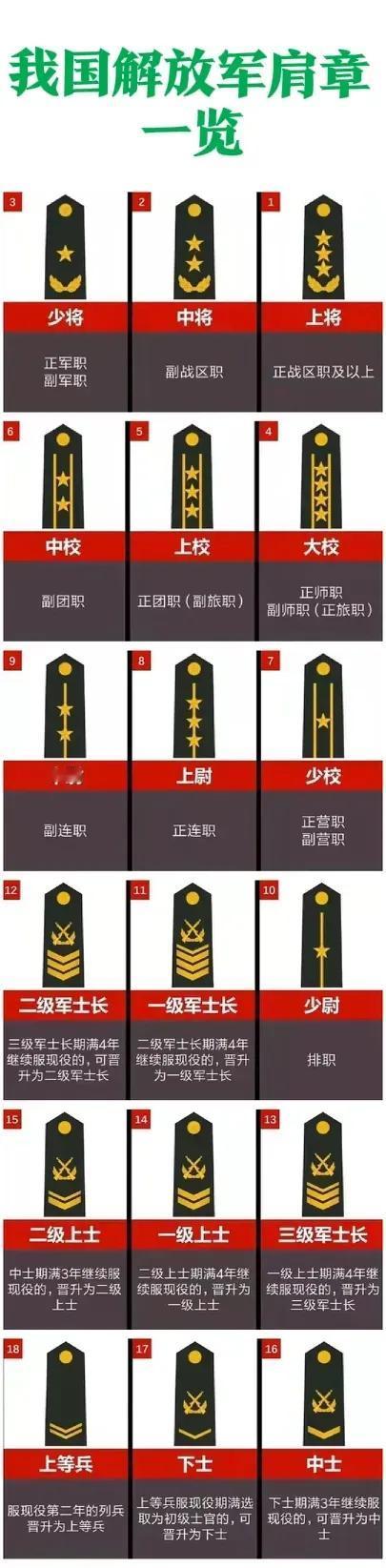 我国目前的军衔和肩章是参考的苏联吗? 不是。 我国在1955年首次设立军衔制的时候,由于当时中苏关系密切,主要参考了苏联模式。 而1965年我国取消了军衔制,全军统一着装,回到了官兵一致的革命传统,用行政级别替代军衔进行划分。 1988年我国第二次授衔,此时我国的军衔制不再以苏联为模板,取消了元帅、大将和大尉军衔,而且还增设了士官军衔。 所以我国目前的军衔制跟曾经的苏联没什么太大的关系,是我国独有的特色。 下图是我们解放军陆军的肩章,陆军肩章是深橄榄绿色,海军军征是深藏青色,空军肩章是深蓝灰色。
