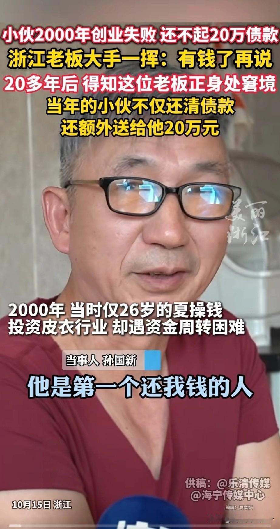 善良是有回响的!2000年的时候,浙江老板看到合作伙伴资金周转困难,主动赊几十万的货物给他。被赊货的小伙当时才26岁,生意刚起步,他很感动。 等到小伙有能力了,想去还钱的时候,老板离开了那里,电话号码也换了,小伙联系不到他了。 但是这么多年,当年的小伙,如今已经成了中年人的夏操钱,一直没有放弃寻找帮他度过难关的老板孙国新。 终于在2023年,老夏通过媒体打听到了孙老板的近况,孙老板现在过得很不好,前妻去世,大儿子结婚。小儿子还在上学,他和现在在食堂给人家烧饭,一年才赚5万块。 夏操钱了解到孙国新还想开超市东山再起的想法后,除了还钱,还主动另外拿出20万给孙国新,当做给他开超市的启动资金。 孙国新很感慨,当初他生意做的大,为人豪爽,借出去的欠款到现在还有700多万没收回来。可是这么多年,第一个主动还钱的就只有夏操钱。 有网友说,两个人都是好人,这是好人遇到一起了。 是的,孙国新如果没有当年的善举,也不会有今天的福报。夏操钱也是,知恩图报,这样的生意人才会走的更长久。就是问问那些欠钱的人,你们的良心不会痛吗? 对于这件事,你怎么看呢?