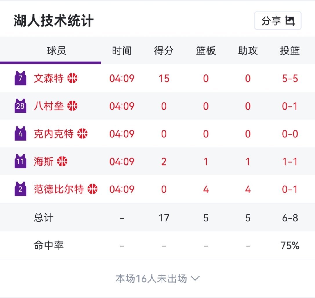 我湖最后一节的数据让人暖心湖人末节8分 不过季前赛总归没有太强的参考性,是好是坏