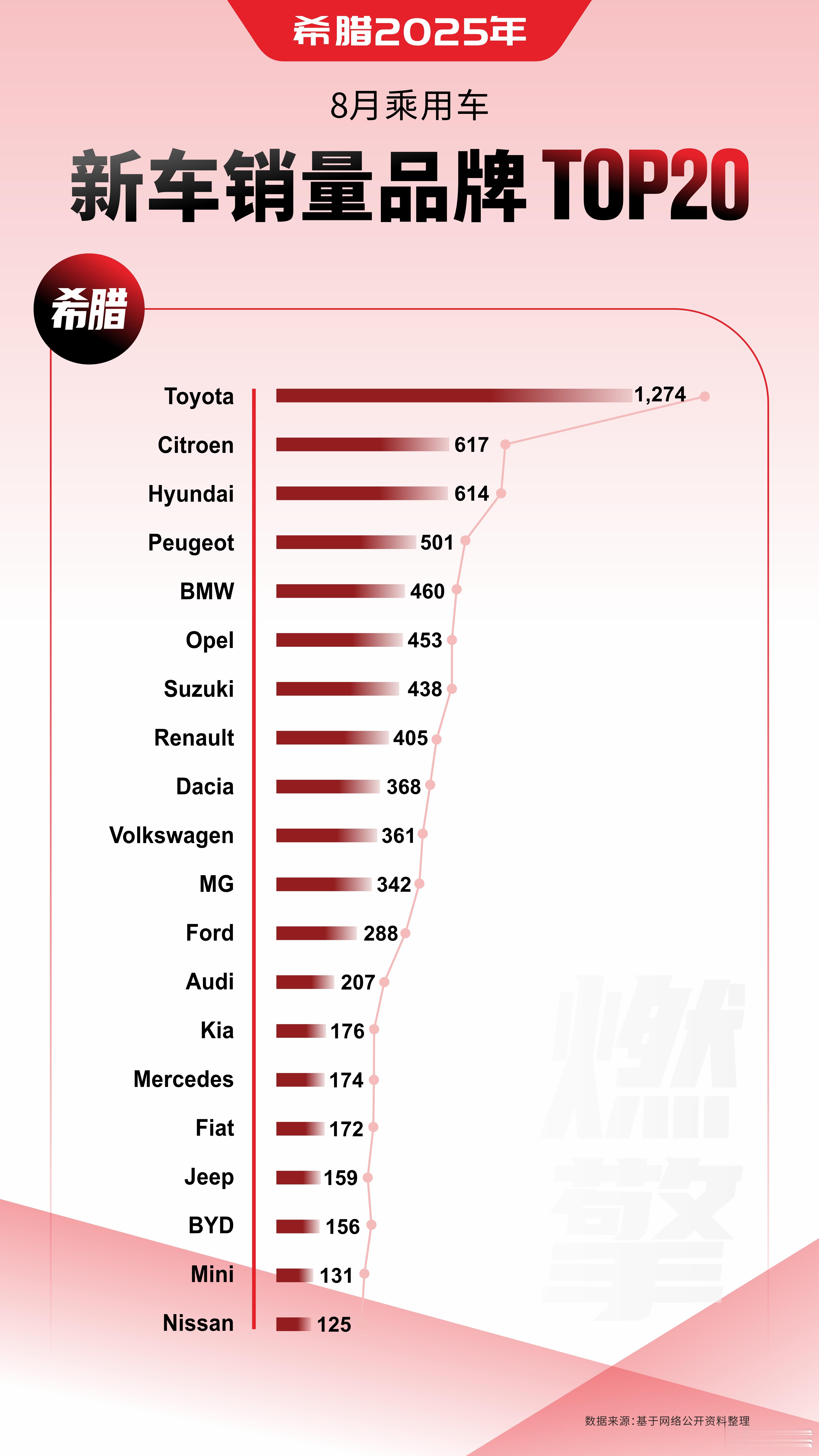 希腊2025年8月乘用车市场呈现 “丰田领跑,欧系品牌紧随,中国品牌成功破局” 的竞争格局,市场正迎来新的参与者。