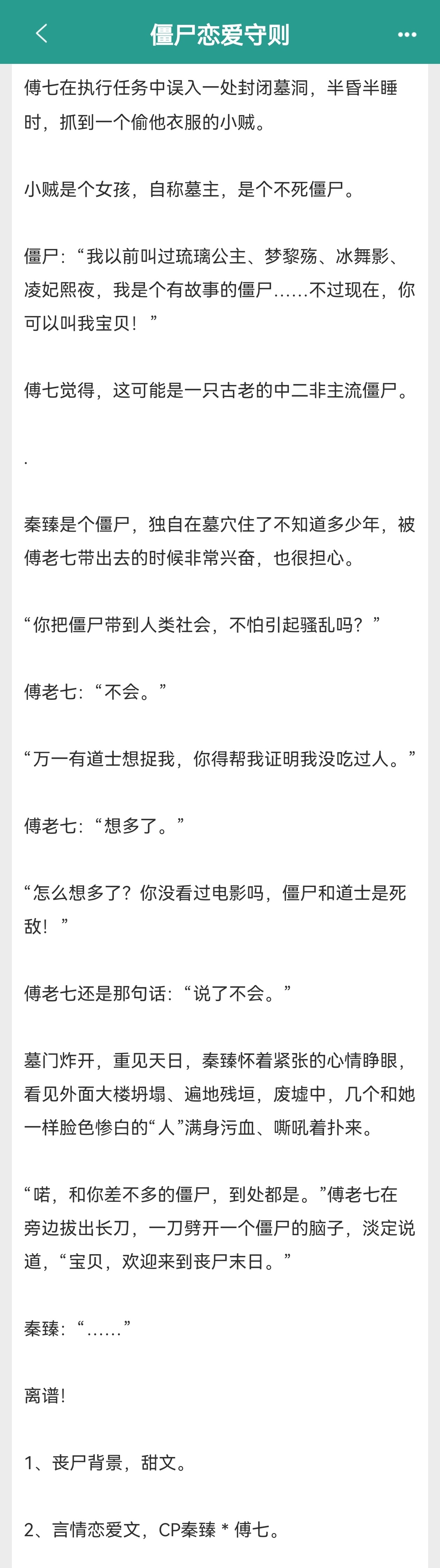 到后面女主的真实身份暴露了,男主为了保护女主和女主分开走,并竭力保护住女主不被当做末日解药一样被人争夺。最后女主配合国家研制出了解药,并在这期间慢慢恢复成了活人的样子,最后醒来后和男主在一起了。总的来说,这篇文是比较偏日常向的,读着蛮搞笑蛮解压的,推荐!