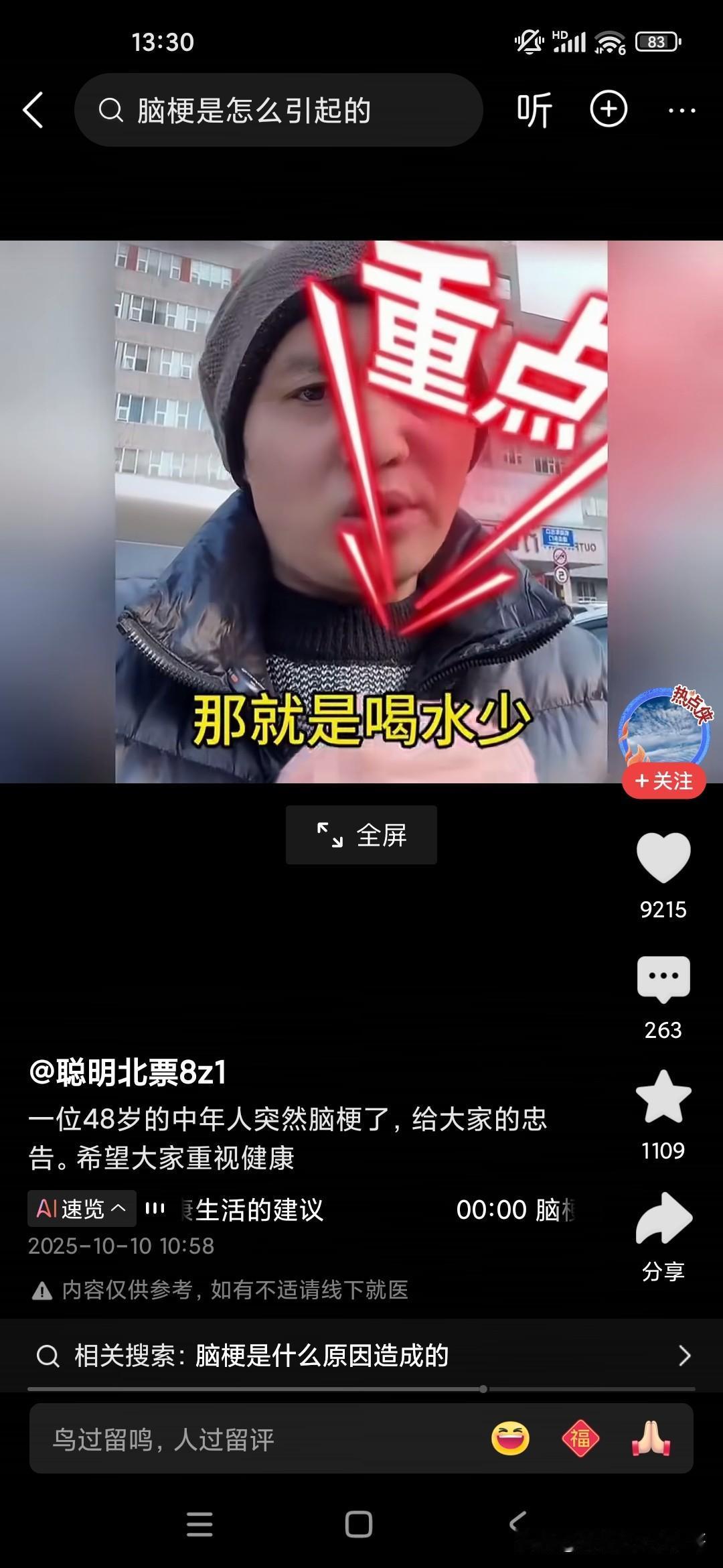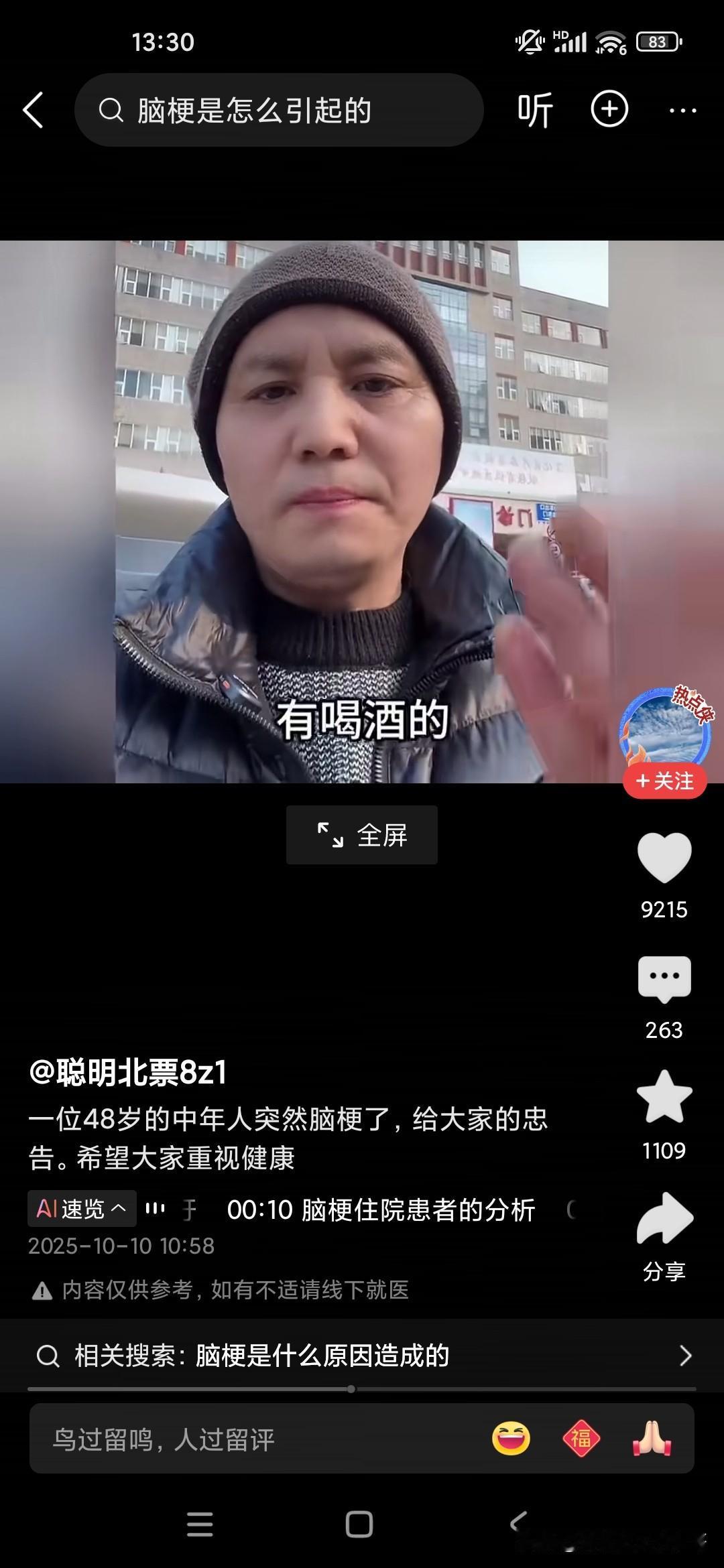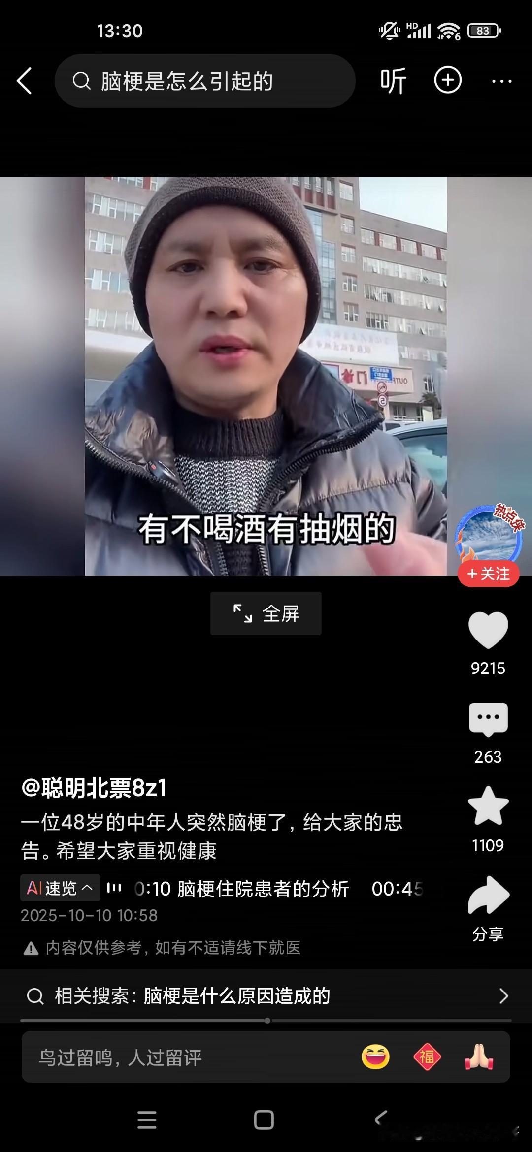 大家一定要对脑梗充满敬畏,千万不要觉得脑梗离自己很远,尤其是独身人士,自己一个人住家里,平常又熬夜又喝酒,又不爱喝水,又抽烟,生活习惯不良,生活作息不规律,而且也又不参加运动锻炼,睡眠严重不足,年年又不去体检,这些人都是高危人群,大家不要觉得这个脑梗似乎只与老年人相关,这位大哥去医院里住了10多天,就发现很多都是50岁以下的,有的甚至最年轻的,只有29岁,这些人有一个共同特点就是不爱喝水,只爱喝饮料,同时的话有贱货,有其他的喝酒,抽烟,情绪不稳定,熬夜打麻将,然后不锻炼或者肥胖等等原因,大家一定要反省自己,爱惜自己,尊重自然规律!
