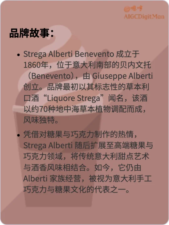 文化象征性包装: 以神秘“女巫”形象(Strega 在意大利语意为“女巫”)为品牌标志,传递贝内文托地区的民俗传奇与浪漫色彩。