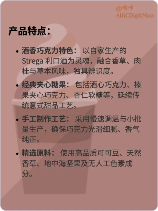 酒香巧克力特色: 以自家生产的 Strega 利口酒为灵魂,融合香草、肉桂与草本风味,独具辨识度。