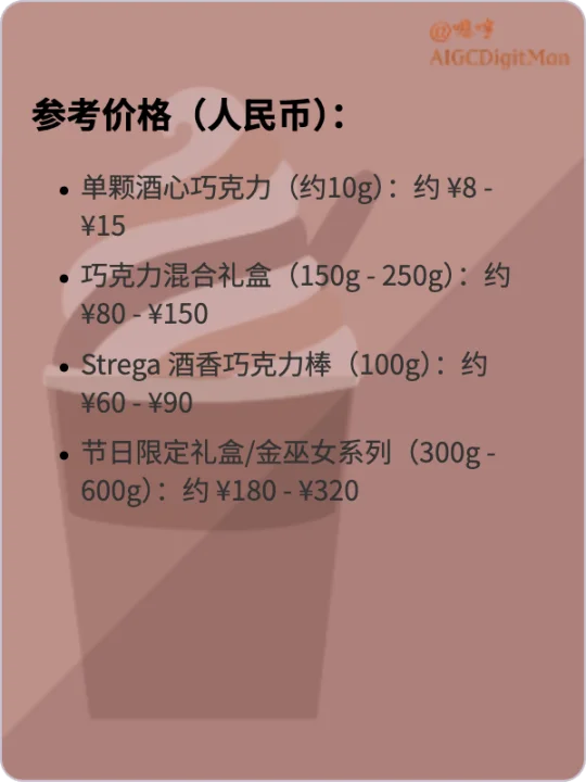 单颗酒心巧克力(约10g):约 ¥8 - ¥15