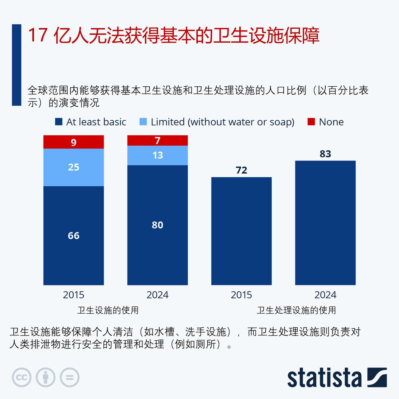17 亿人无法获得基本的卫生设施保障 每年的 10 月 15 日是全球洗手日,其目的在于提高人们对“用肥皂洗手对于预防疾病和拯救生命的重要性”的认识。使用肥皂洗手能够有效遏制疾病的传播并拯救生命:根据联合国儿童基金会和世界卫生组织的数据,每年因不卫生的洗手习惯导致的腹泻死亡人数达 39.4 万,急性呼吸道感染死亡人数达 35.6 万。 总体而言,每年约有 140 万人(其中包括 40 万名五岁以下儿童)死于由水资源不足、卫生设施缺乏以及卫生习惯不良导致的可预防疾病。尽管全球范围内已取得了一些进展,但在 2024 年,仍有约 17 亿人无法获得基本的卫生设施,其中包括 6.11 亿人完全没有洗手设施。2024 年,估计有 83%的人口能够使用卫生设施,这些设施能够安全管理和处理人类排泄物(最常见的就是厕所)。不妥善处理人类排泄物可能会导致疾病传播,如腹泻、霍乱或伤寒等,这些疾病对儿童的影响尤为严重,并可能导致终身健康问题甚至死亡。