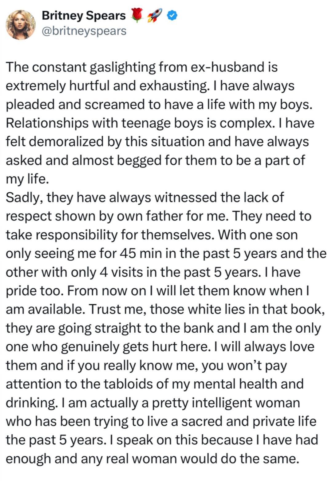 布兰妮在社交媒体上回怼前夫凯文·费德林新书中说她孩子害怕她,因为她拿着刀睡觉的谣言,她写道: “前夫持续的喋喋不休持续“煤气灯效应”极其伤人且令人精疲力竭。我一直恳求并渴望能和我的儿子们一起生活。和十几岁的男孩建立关系很复杂。这种情况让我感到士气低落,我一直请求甚至几乎乞求他们成为我生活的一部分。 遗憾的是,他们一直目睹自己的父亲对我缺乏尊重。他们需要对自己负责。在过去五年里,一个儿子只见过我45分钟,另一个儿子只来看过我四次。我也曾为此感到自豪(此处可能表达复杂情感,结合前文或为反讽等复杂意味)。从现在起,我会让他们知道我什么时候有空。相信我,那本书里的那些借口都是胡扯,我才是唯一一个在这里受伤的人。我会一直爱他们,如果你真的了解我,你就不会在意那些关于我心理健康和酗酒的小道消息。实际上,在过去五年里,我一直努力过着神圣而私密的生活,我是个相当聪明的女人。我谈及此事是因为我已经受够了,任何真正的女性都会这么做。”