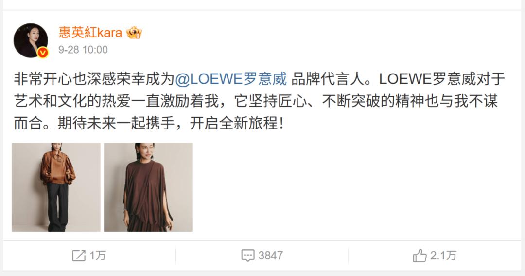 最近,“红姐”、“卡妹” 惠英红成为西班牙奢侈品牌 LOEWE 的代言人。 惠英红是香港影坛的大姐,中国的传奇影后,叫一声“红姐”值得。 另外惠英红的英文名为 Kara(卡拉),她也是我心中的“卡妹”。 在65岁成为时尚品牌 LOEWE 的代言人,太牛了。