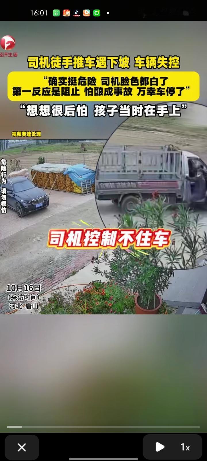 10月16日,河北唐山。男子出门准备送孩子上学,看见司机在徒手推车,车子遇到遇下坡导致失控,万幸车子停住了。 当事人李先生介绍,司机是他的邻居,平时关系很不错。刚才确实挺危险,司机脸色都白了,第一反应是上前阻止,怕酿成事故,手有点擦伤,想想这事挺后怕的