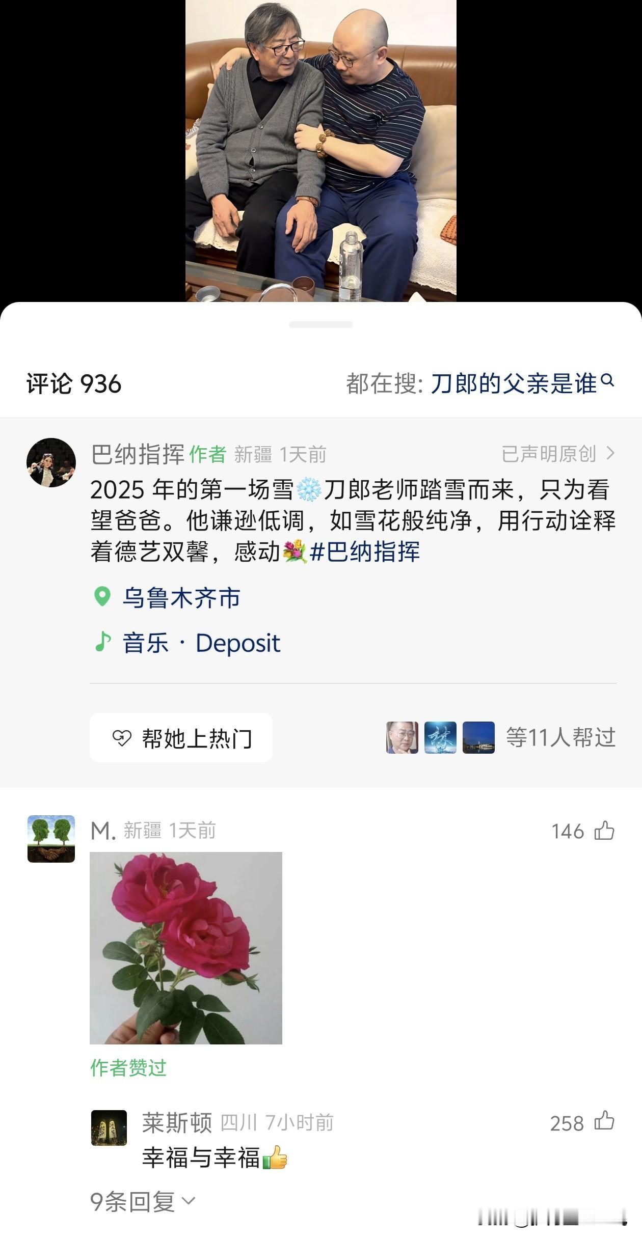 刀郎演唱会后,开启了走亲访友模式! 这不,在乌鲁木齐2025年第一场雪来临之际,刀郎迎着风雪, 去看望拜访新疆著名指挥家~新疆音乐家协会名誉主席努斯来提.瓦吉丁老先生! 一见面,他们像老朋友一样谈笑风生,刀郎叫老先生保重身体,以后会常来看他, 据悉老先生送了一串手链珠子给刀郎,看看手上戴的那个! 相见温暖融洽,时而听到刀郎爽郎的笑声,老先生女儿巴纳指挥还发了视频, 留下这美好的相聚时刻! 刀郎不是为了资源,而是情怀,是时候该好好放松了。 希望刀郎老师好好放松心情,走亲访友放松心情,好好保重身体! 大家觉得呢?