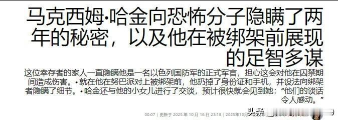 整整两年之后,以色列今天终于承认了被其歪曲为“平民人质”的多名在哈马斯实施的“阿克萨洪水”军事行动中被俘的以色列军官与士兵: 罗姆·布拉斯拉夫斯基,10月13日获释。他事实上是以色列国防军中央司令部后勤部队的一名常备军现役士兵,此前以色列政府谎称他是在音乐节上“被绑架的平民”。 巴尔·阿夫拉哈姆·库珀斯坦,10月13日获释。他事实上是以色列国防军第933“纳哈尔”步兵旅第932营的常备军现役士兵,此前以色列政府谎称他是音乐节上的“医护人员”,并声称他的职业是“志愿者”。巴尔的母亲声称,他被俘前确实为受伤的人提供给急救帮助,所以称其“医护人员”完全合理,他是不是现役士兵并不重要。 阿维纳坦·奥尔,10月13日获释。他曾在以色列国防军“拉蒙”营服役,2018年因建制撤销而编入某突击队。这个人就是就是那个著名的诺亚·阿加马尼的男朋友,此前以色列政府谎称他是音乐节上“被绑架的平民”。他的父亲今天声称:“我们尽量不提这件事(他是士兵)。我们害怕他们(哈马斯)会发现。” 约瑟夫·海姆·奥哈纳,10月13日获释。他事实上是以军第84“吉瓦蒂”步兵旅的指挥官,此前以色列政府谎称他是音乐节上“被绑架的平民”。他的父亲今天说,他在被俘时想办法隐瞒了自己的军事指挥官身份,因为害怕以他的职位可能会被直接枪毙了。 因巴尔·海曼,10月15日移交尸体。她事实上是以色列国防军第512“帕兰”步兵旅第33“狞猫”营(以女兵为主的作战营)的指挥官,此前以色列政府谎称她是“逃脱音乐会现场的三小时后被绑架的女性平民”。根据先前的官方讣告,第33“狞猫”营的副营长阿夫拉罕·霍韦拉什维利中校也在2023年10月7日的战斗中被当场击毙。 10月15日晚上与因巴尔·海曼被一起送还的另一具尸体是穆罕默德·阿特拉什军士长,他是以军加沙师北方旅的观察员,在纳哈尔奥兹地区的战斗中被杀,尸体被带走。然而非常幽默的是,由于他是阿拉伯人,所以以色列政府没有给他包装一个平民的虚假身份,以色列军方也在2024年夏季发布了他的讣告。 另一名10月13日获释的以色列国防军军官马克西姆·哈金今天甚至直接出来嘚瑟,说当初他被俘时果断扔掉了身份证件与手机,然后假装自己是平民,简直是太聪明了。 据报道,上述以色列战俘的家属也被以色列政府勒令保守其军人身份的秘密,以服务于以色列政府对外编造的系统性谎言。