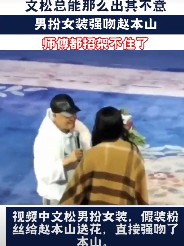 太搞笑了!文松意男扮女装突袭强吻赵本山,师傅当场懵圈招架不住 提起文松,“出其不意”似乎成了他的标签。这不,在某次演出中,他直接以女装造型登场,更突然上前强吻师傅赵本山,一系列操作又萌又敢,让见惯大场面的赵本山都瞬间懵圈,下了一大跳,当场露出招架不住的反应,喜剧效果直接拉满。