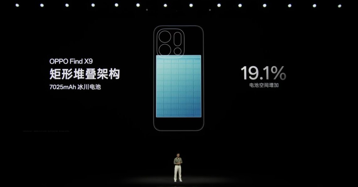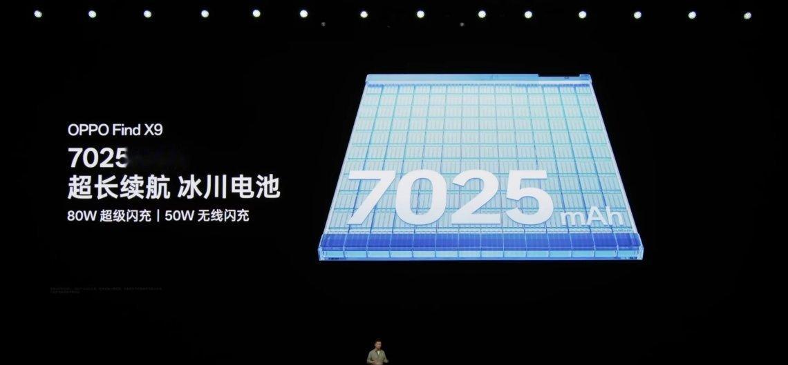 OPPO Find X9 标准版采用矩形堆叠架构,7025mAh 冰川电池(OPPO 自研第四代硅碳负极材料),支持 80W 快充,50W 无线充电、5W 无线反向充电。