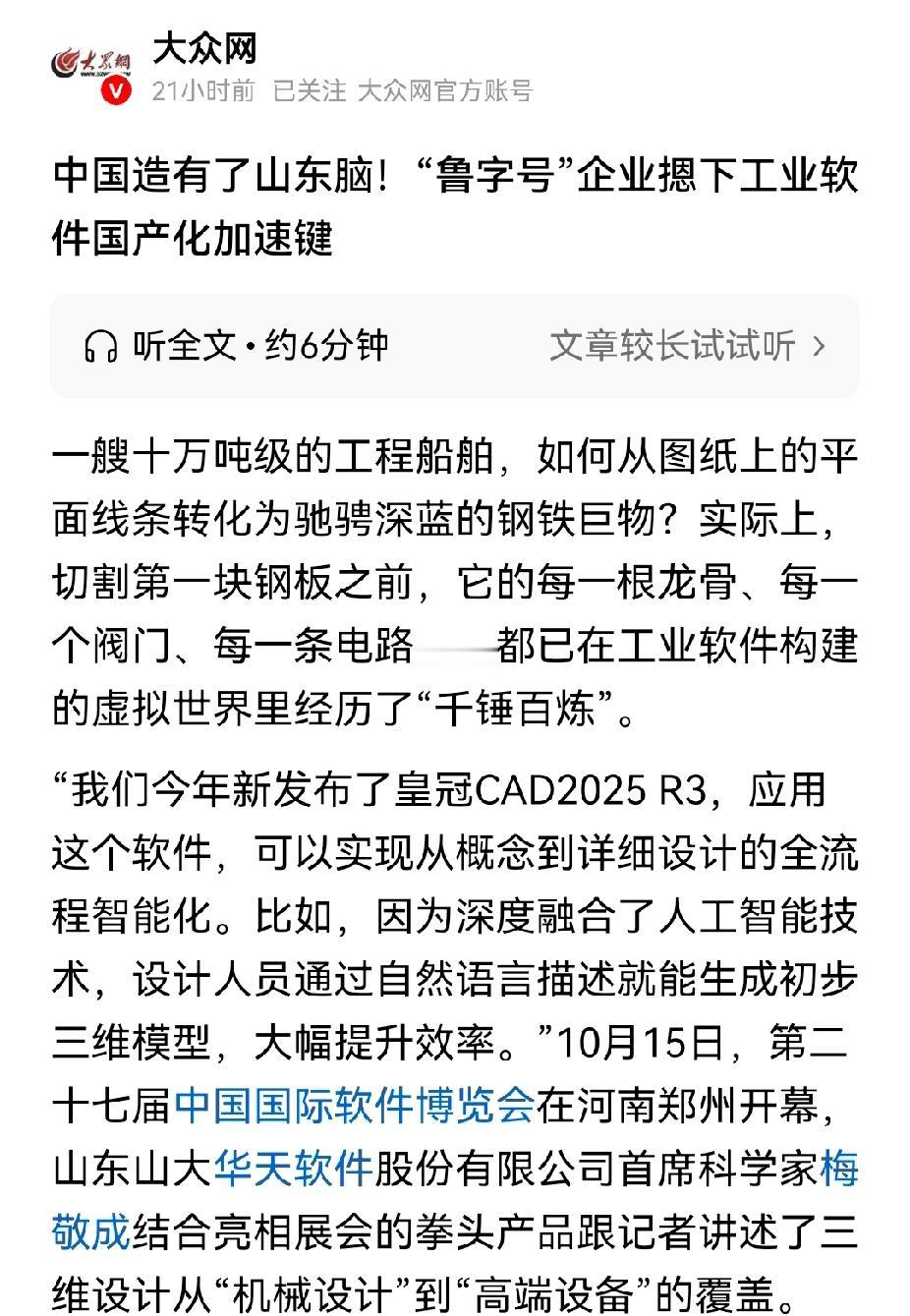 特朗普要在工业软件领域对中国实行出口禁运,山东特别是济南要挑大旗了。 最近特朗普在社交媒体上表示将对中国进行“所有关键软件”的出口管制。管制将于11月1日正式实施,或视情况提前生效,但未展开说明管制的定义和细节。 由此可见,美国要对中国实行关键软件禁运了。美国此次关键软件出口管制,可能涉及EDA、CAD、CAE、MES、PLM等方向。 关键软件一般是指支撑国家关键领域运行、保障系统安全且难以替代的软件,对国家安全、经济建设、社会稳定等方面有重要意义。 关键软件包括以下软件: 1、 关键基础软件。比如操作系统、数据库管理系统、中间件等。 2、工业软件。包括CAD、CAE、CAM、EDA等工业设计类软件和PLC、DCS等工业控制类软件等。 3、行业应用软件。比如银行、证券、医院、教育等行业的核心业务系统等等。 4、新型平台软件。包括云计算平台软件、大数据平台软件、人工智能平台软件等。 5、 嵌入式软件。顾名思义,就是把软件嵌入到硬件设备当中,实现对硬件的控制和管理,提升设备的功能和性能,比如智能手机、汽车电子控制系统中的软件等。 长期以来,我国的关键软件都是从外国进口。特别是工业软件,对外依存程度高达90%以上。 这次特朗普真的要动手了。但是幸好中国有山东,山东有济南。一旦关键软件被禁运,那么将会挑起大旗。 2025年1-4月,山东关键软件销售收入344亿元,规模居全国首位。山东的工业软件销售收入规模接近全国的四分之一。而济南的软件产业,更是占到山东一半了。 随着济南工业软件研究院等一批科研机构以及山东华天等一批公司的努力,中国已经初步具备了反制美国工业软件制裁的能力。特朗普这次怕是又要失望了。