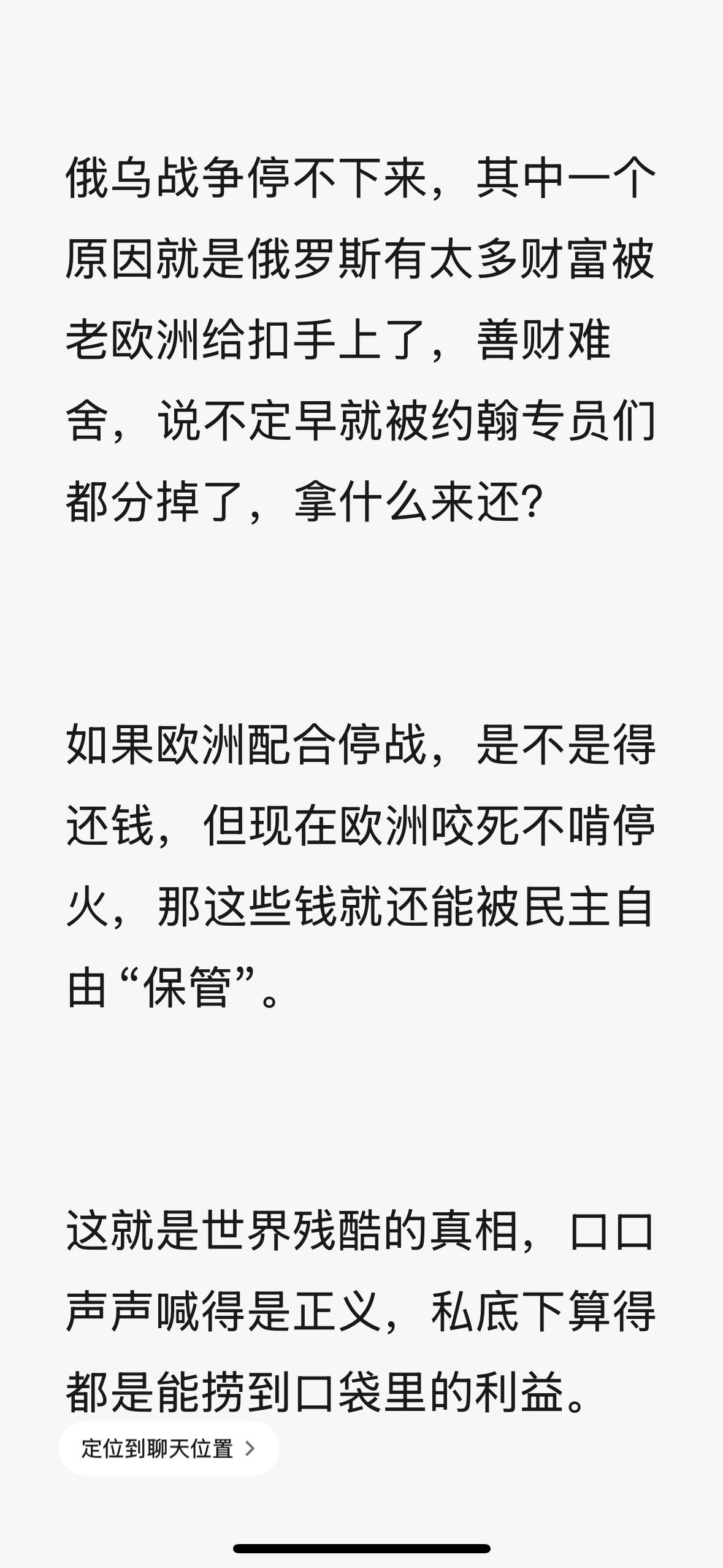 这个角度真神奇! 谁都知道,只要打人的停手,退回边界,马上就可以停下来! 无耻如以色列,都能撤兵,马上就能停火! 到了乌克兰这,一个个在骂乌克兰怎么还在抵抗,割地赔款不香吗!?一个个在骂欧洲,怎么就愿意给钱!哼!肯定去因为“利益”!欧洲真无耻! 也不看看,谁在说,俄罗斯赢,对谁谁有利,这难道不是为了“利益”? 想起一个梗 如果说,乌克兰,只要你还剩下一个人,砸锅卖铁我都会支持你! 解读:欧美无耻,欧美想耗掉最后一个乌克兰人! 如果普通人说:亲,只要你还有一口气,砸锅卖铁我都会救你! 解读:真爱啊! 哎!