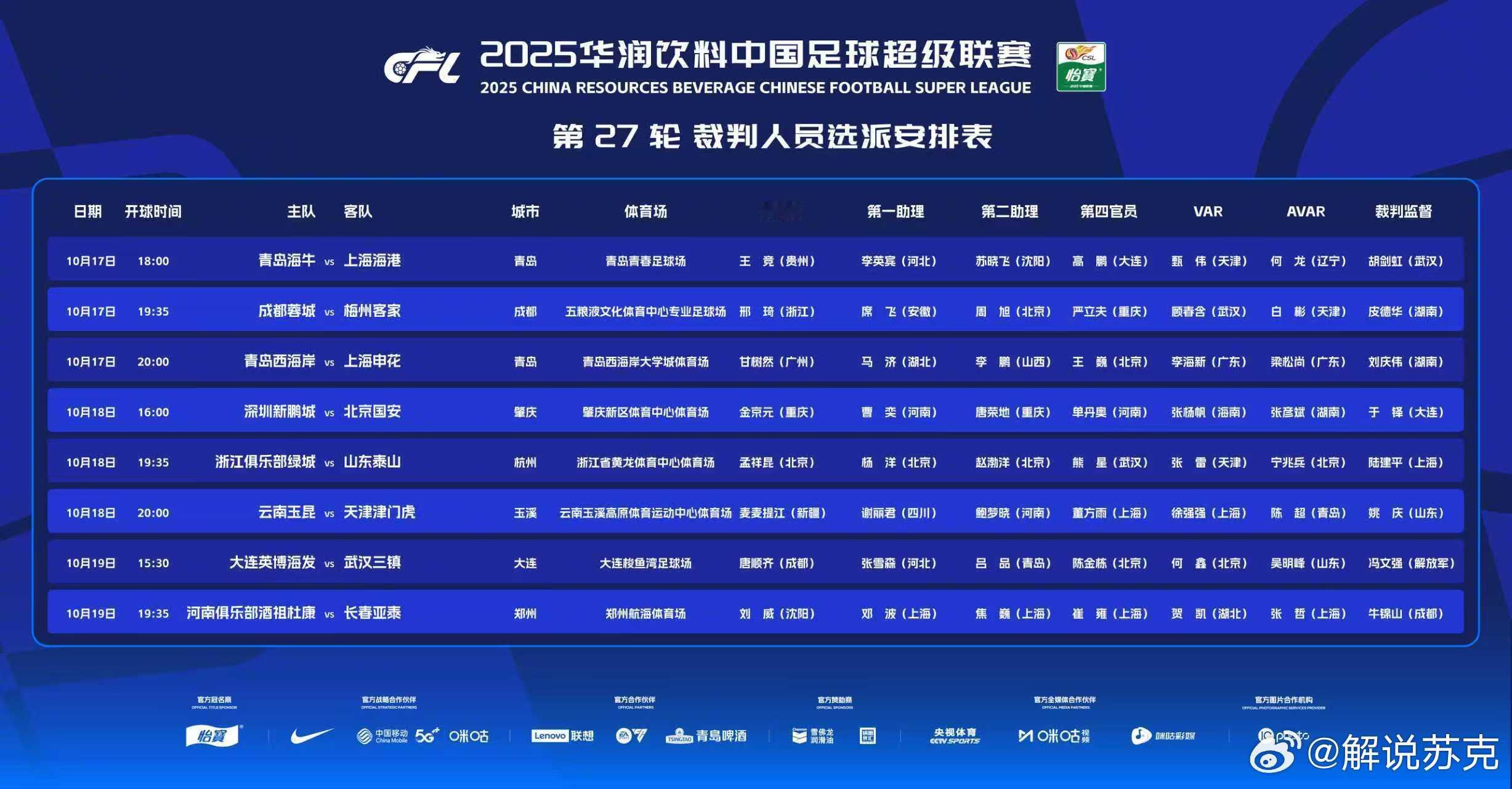 本轮中超联赛的裁判员名单,麦麦提江带着仨位女生裁判来了!