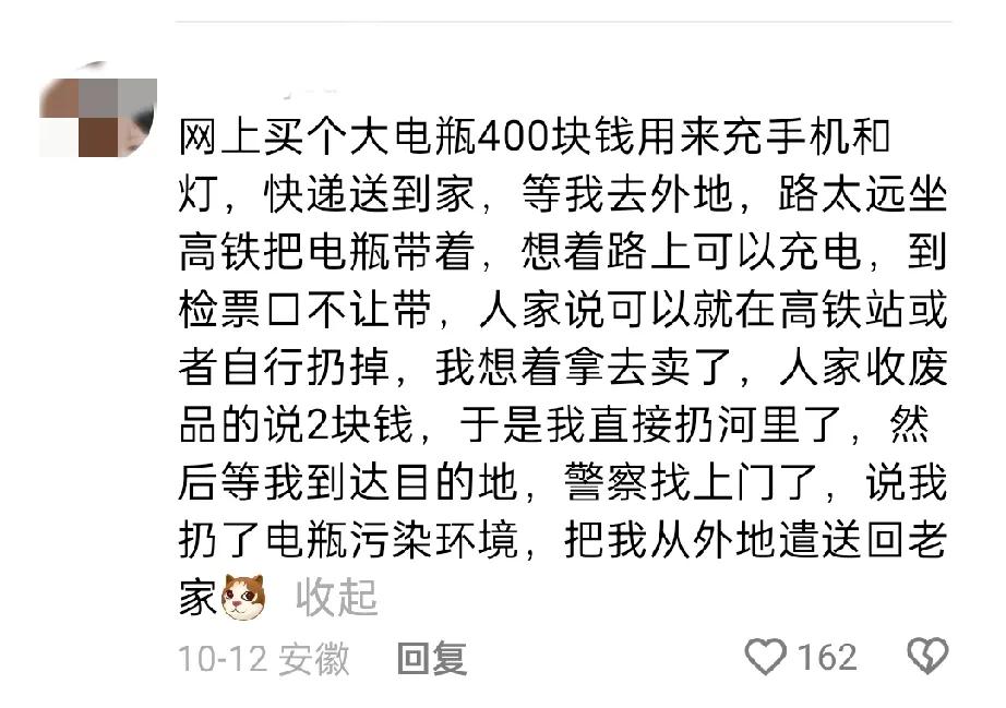 看完这个评论,我到现在还没笑完: 网上买个大电瓶400块钱, 用来充手机和灯,快递送到家, 正好我去外地,路太远要坐高铁 就把电瓶带着,想着路上可以充电, 到检票口不让带, 人家说可以丢在高铁站 或者自行扔掉,我想着拿去卖了, 人家收废品的说2块钱, 于是我直接扔河里了, 然后等我到达目的地, 警察找上门了,说我扔了电瓶污染环境,把我从外地遣送回老家了 ———— 哥们,你可别说这事是真的[捂脸][捂脸][捂脸]