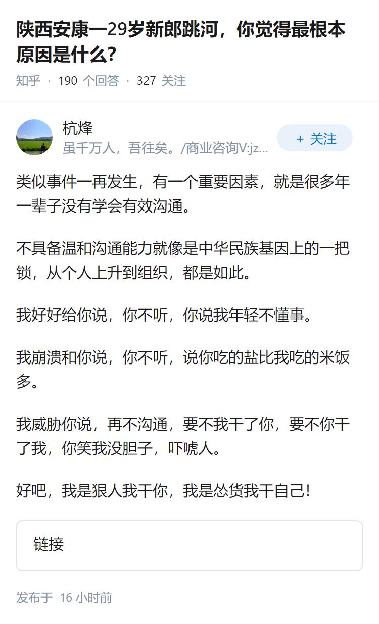陕西安康一29岁新郎跳河,你觉得最根本原因是什么?