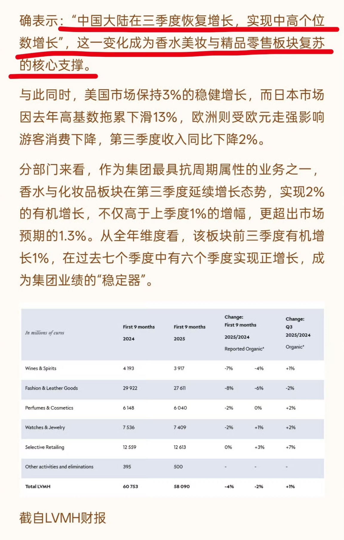 邓为的加持让财报更加靓丽!LVMH发布2025年第三季度,财报显示中国大陆在三季