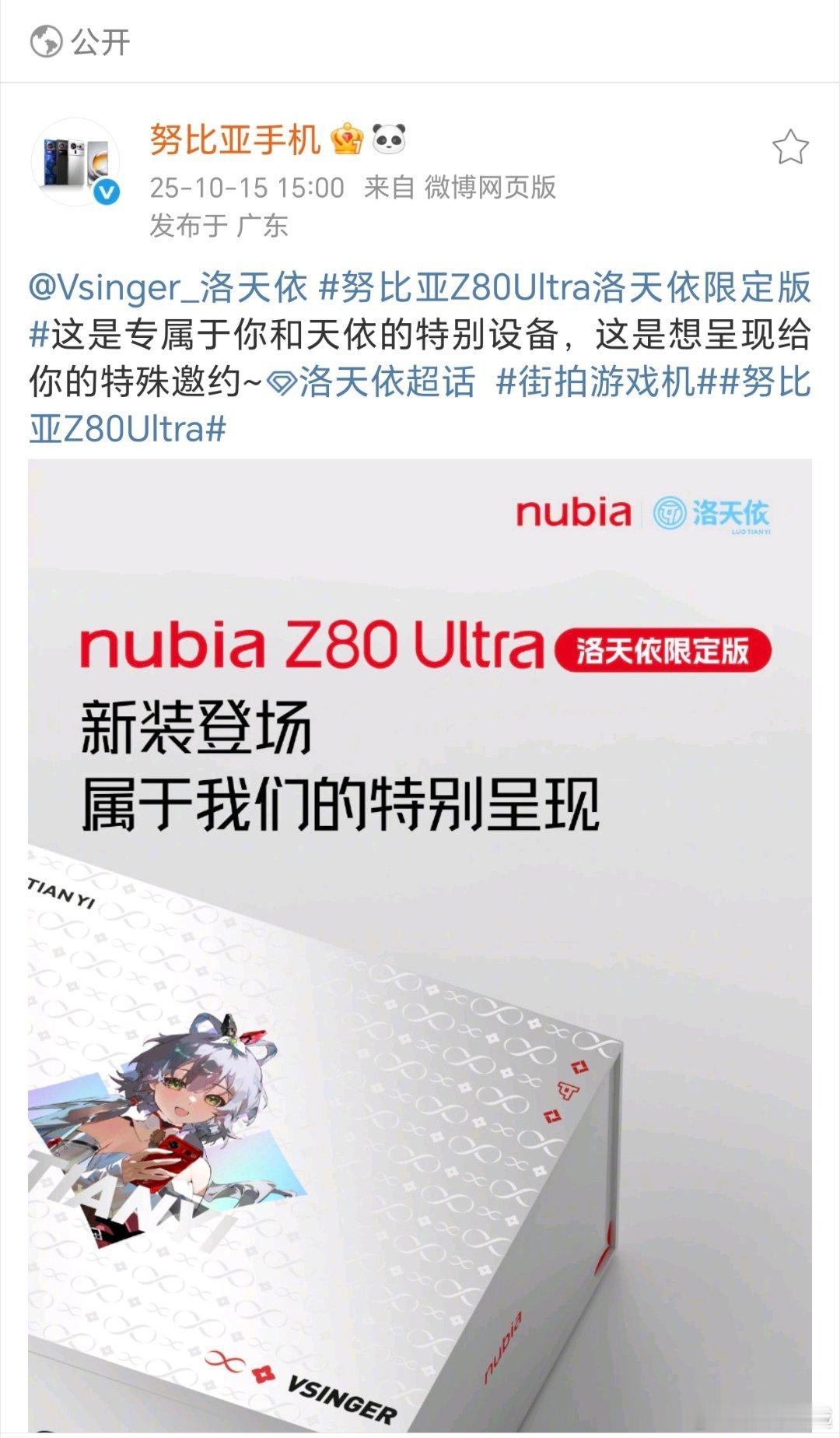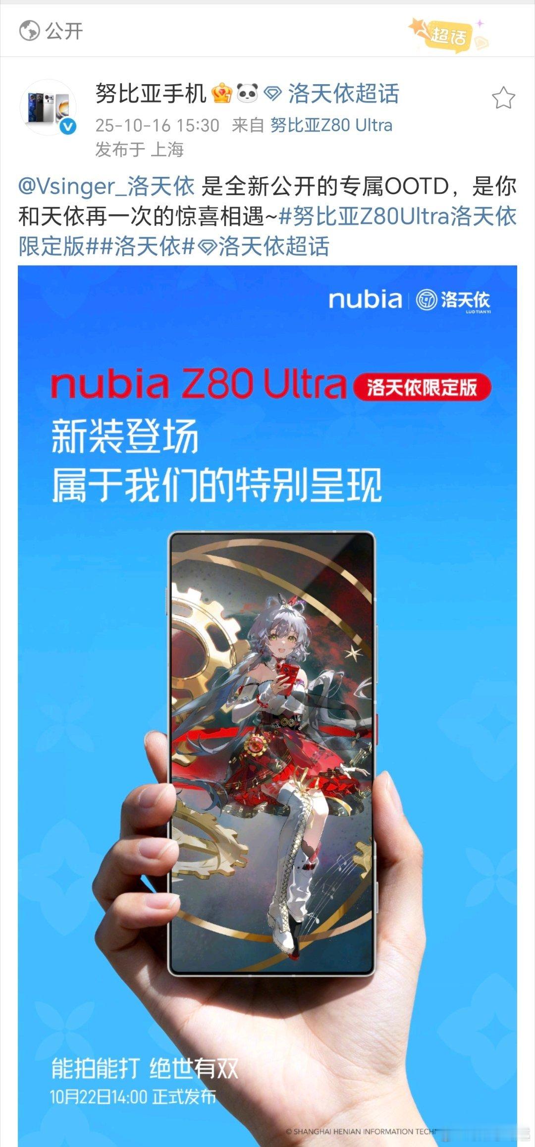 努比亚Z80Ultra街拍游戏机带来的新东西真不少呀!就在刚刚,看到飞总微博曝光的洛天依ID,洛天依限定版来啦!之前有魅影黑配色,以及我手上的凝光白,和独特的星空典藏版, 全新联名的洛天依限定版将会更加惊艳,截止目前还没有外观或者更多的信息,我猜测会有一个联名主体,喜欢洛天依的小伙伴们可有福了!努比亚的外观一直都很有东西,除了行业最独一无二的无孔全面屏以外,这次还有新的定制洛天依配色,感觉今年的努比亚给的惊喜有点多呀,已经越发期待发布会了。