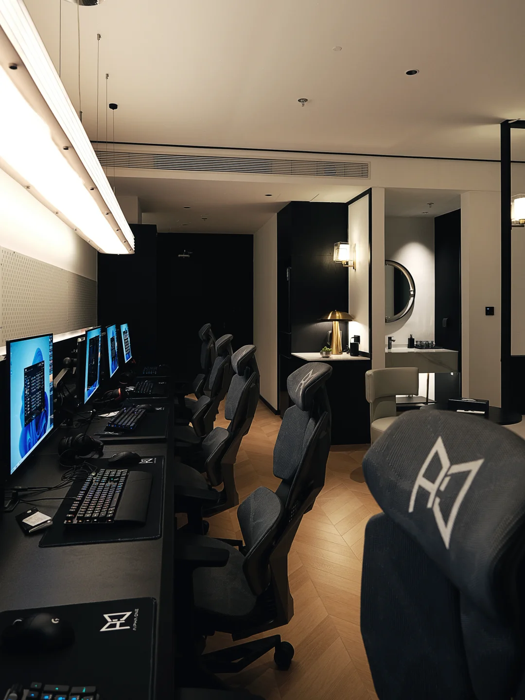 于是,我尝试在自己常规做酒店的框架上,加入了更多对电竞游戏行为的思考,比如擂台式的电竞椅布置,易维护易清理的材料,以及动静分区的房间布局,保护隐私性