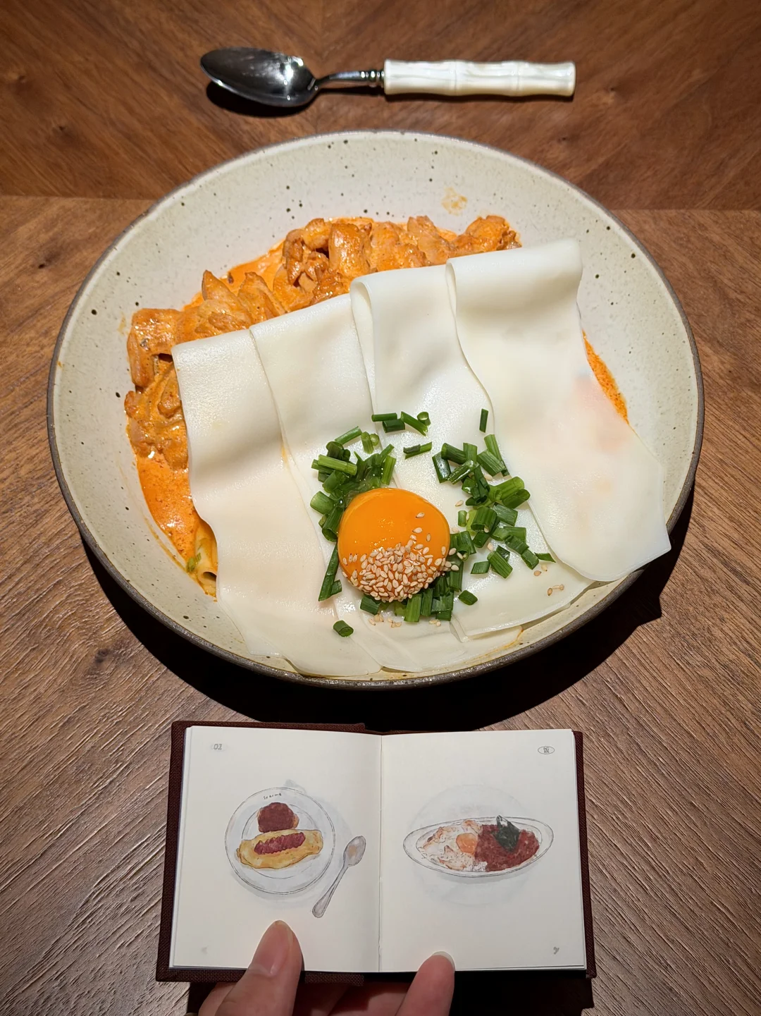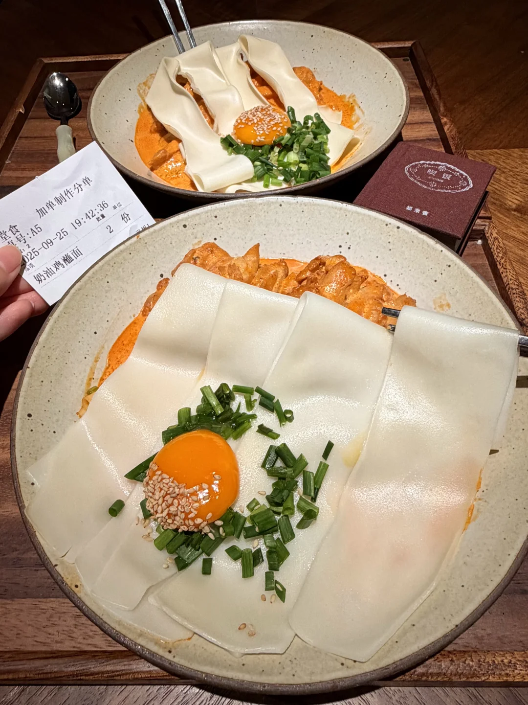 宽面蘸芝麻酱裹上蛋液🍳和辣奶油鸡~口感层次嘎嘎丰富!
