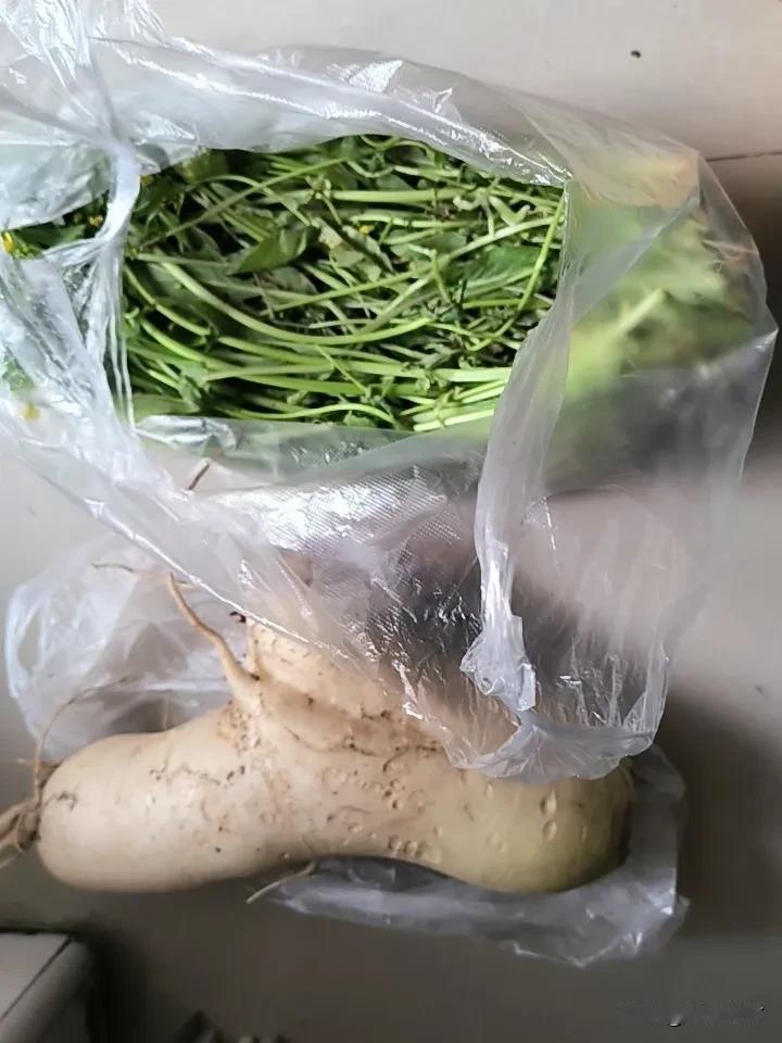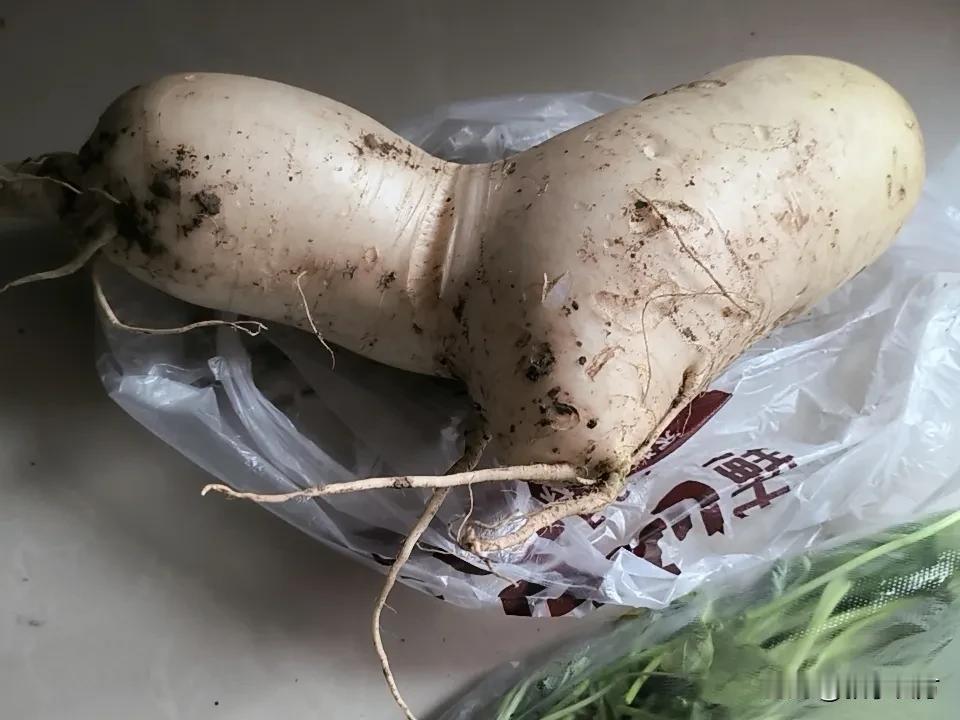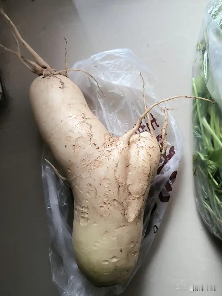 女同桌给我送来一个大人参。。。 刚才我的学生时代的女同桌给我来电话,说她在农村种了一些蔬菜,没打农药的绿色产品,要给我送过来。我听了很高兴,心想,每天都去市场买菜,都说有科技与狠活,我倒要看看不打农药,化肥的绿色蔬菜是什么样的。。。 一个多小时后,老同学来了,我一看,那个绿色蔬菜不知道是什么名字,另一个奇形怪状的感觉就是大萝卜,可是她说这是和东北人参杂交的,营养价值非常大,特意给我留的,不管怎么说也要感谢老同学的好意,晚上,煲汤看看是不是有啥奇效。。。