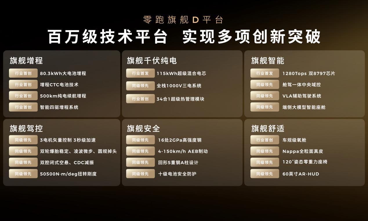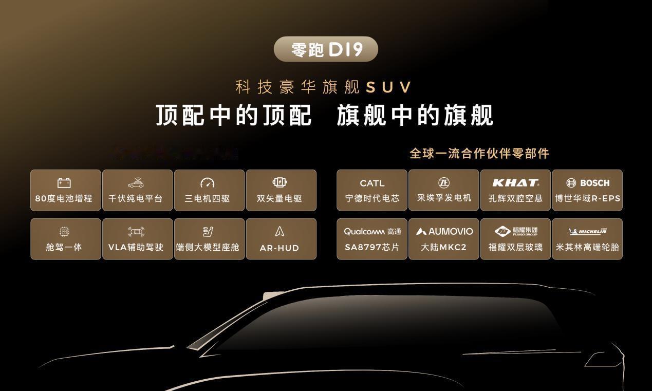 零跑旗舰D平台发布,D系列将杀入高端新能源市场。 很多人一直觉得零跑主攻的就是20万内的新能源家用车市场,这话没错,此前零跑的车型都在这个价位内。但是零跑显然不满足于此,就在10月16日,零跑旗舰D平台技术发布,该平台的首款车型D19也迎来了全球首秀。这一次,零跑直指30万级豪华新能源SUV市场,零跑D系列就将肩负起零跑冲高的重任。 那可能有人会担心,零跑有这个实力吗?别忘了,零跑可是一家坚持了十年全域自研的新势力品牌,如今已经实现了百万台交付,可以说技术底蕴、市场认可都不缺,而且零跑D系列将会延续零跑一向的普惠理念,拒绝“旗舰”就等于“高价”。 我们看到零跑旗舰D平台加持下,零跑D系列车型拥有80度大电池增程,可以做到增程纯电续航500km,这几乎就与一台纯电车无异了。而它的纯电版则将首搭宁德时代混合电芯,115度的电池带来720km的超长续航。更有首发双8797芯片,让其综合算力达到了1280TOPS,从而实现更强的智能座舱和辅助驾驶表现。甚至于零跑D系列还将首搭制氧舱,也就是说你如果开着它去高原自驾的话,随时随地都能吸氧缓解高反。 不得不说,零跑D系列将真正做到30万级价格、百万级体验,这样的旗舰谁会拒绝呢?所以你现在还怀疑零跑的冲高实力吗?零跑 零跑发布旗舰D平台